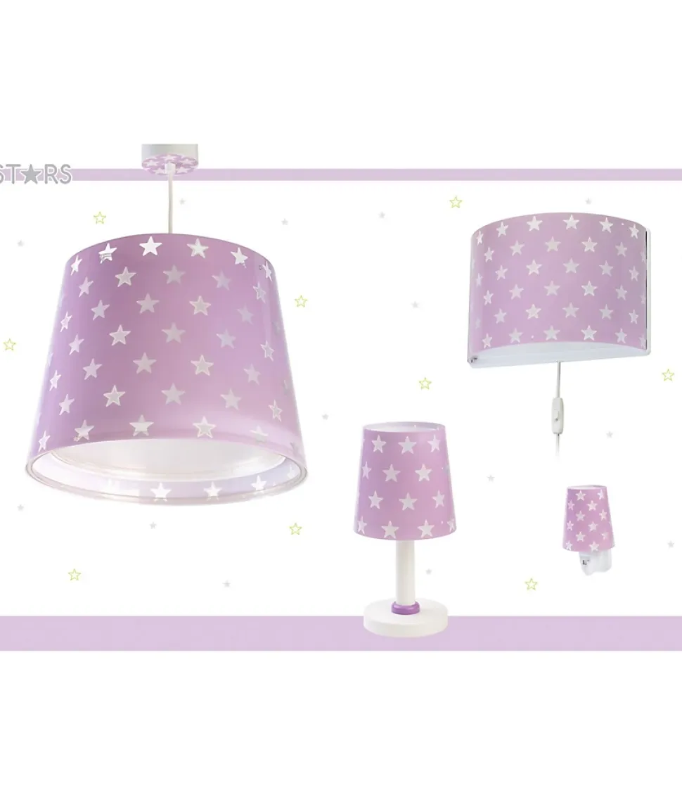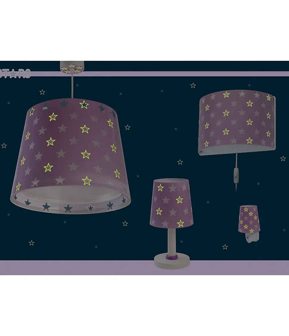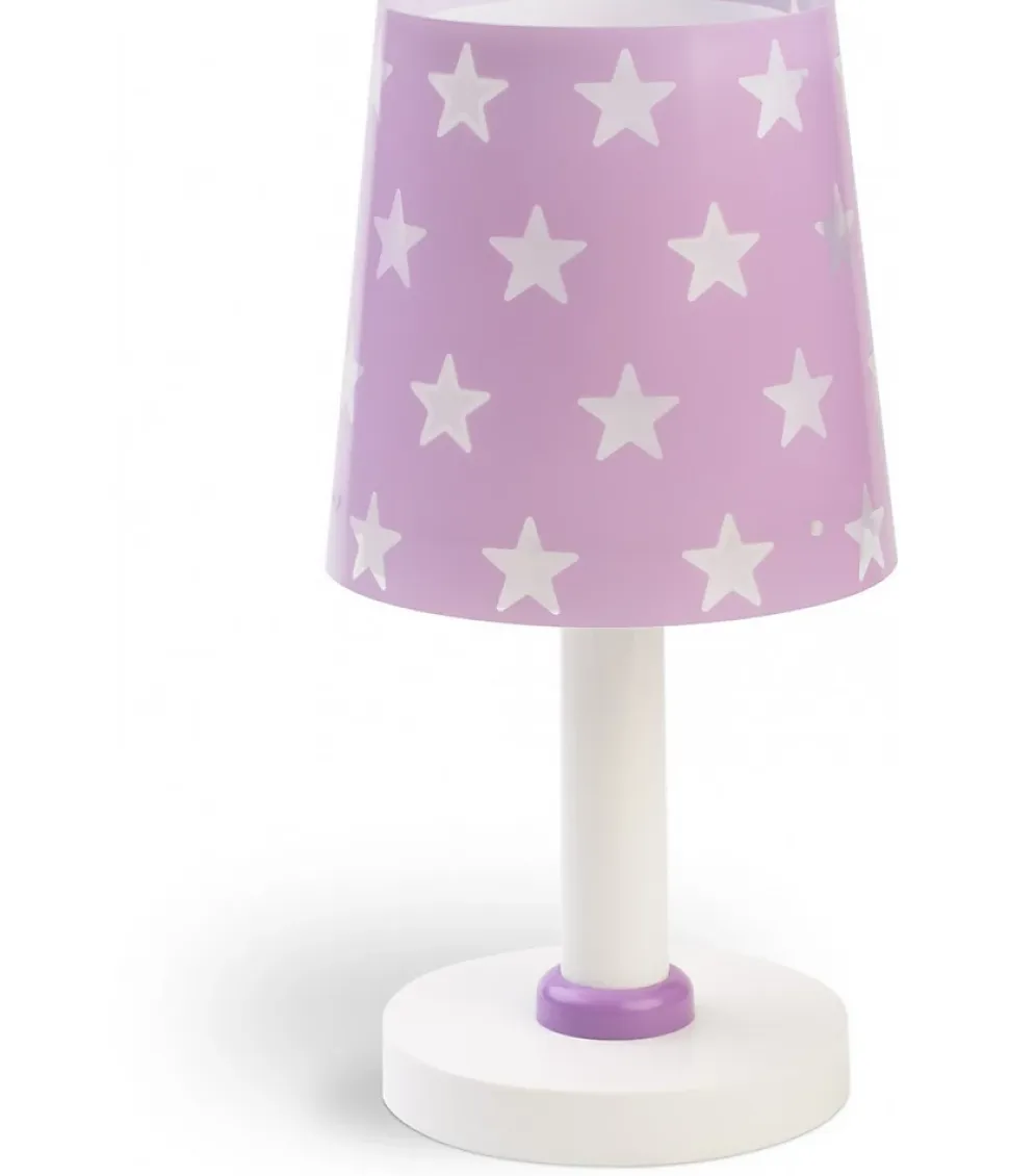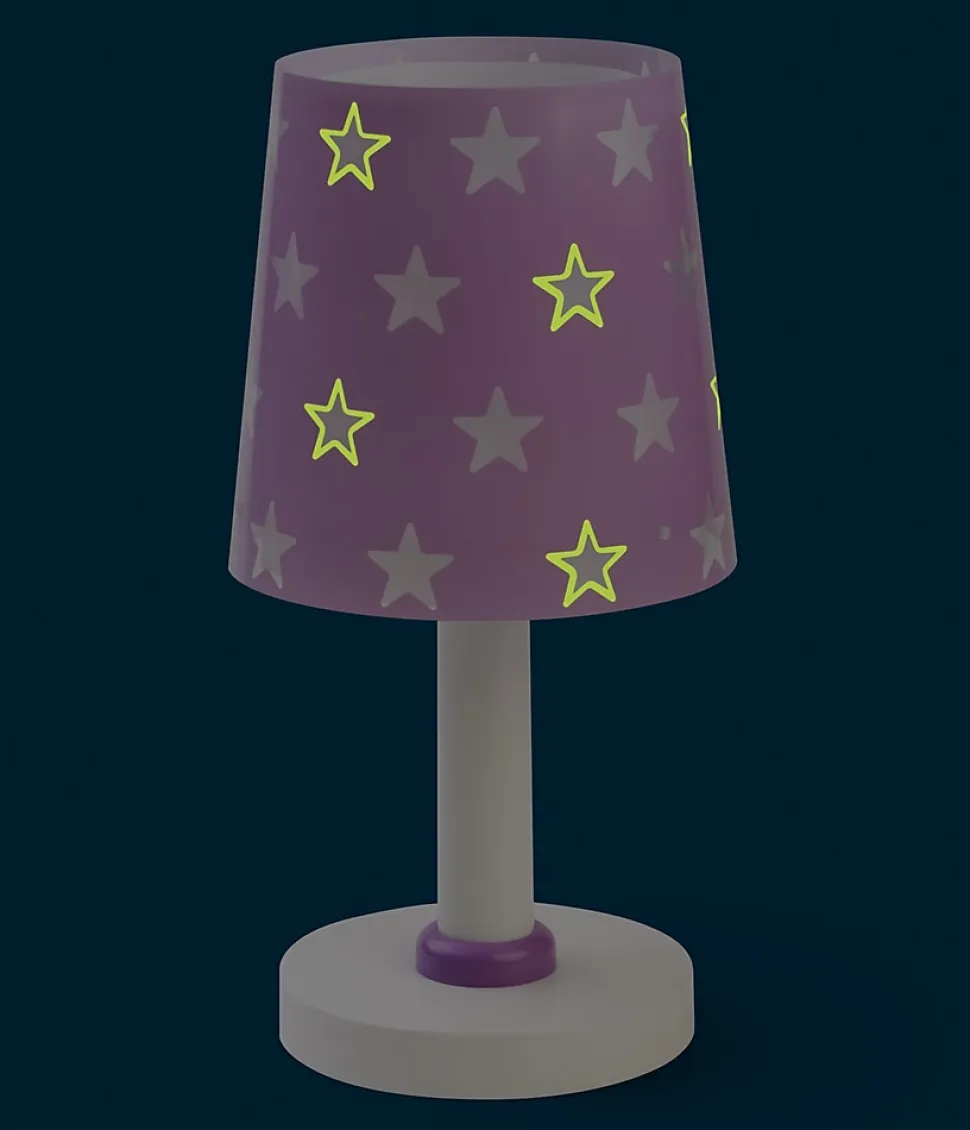 Lampe de chevet étoile pour enfants mauveLa lampe de chevet étoile de la collection Stars, de couleur mauve, apportera ce motif étoile original sur la petite table de la chambre des enfants. Avec double écran en polypropylène transparent pour garantir une utilisation totalement sûre par les enfants. Les étoiles de la lampe pour enfant avec étoiles de la collection Stars brillent dans le noir : lorsque la lumière est éteinte, pendant quelques minutes la lueur des étoiles accompagnera les plus petits pendant qu’ils s’endorment.Combinez la lampe de table à étoiles avec les autres lampes pour enfants de la même collection pour réaliser un ensemble unique et original