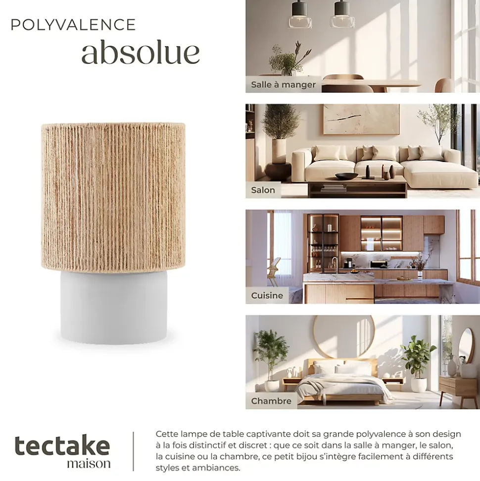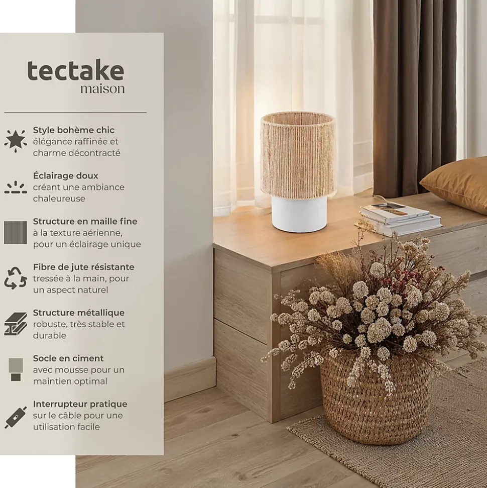 Une touche lumineuse au charme bohèmeApportez une lumière pleine de caractère à votre intérieur avec la lampe de chevet Klea de tectake. Son abat-jour raffiné en jute naturelle, façonné selon une technique d’enroulement unique, attire tous les regards et sublime les intérieurs dans un style bohème élégant.Un design aussi esthétique que réfléchiLa structure ajourée en fibres fines diffuse une lumière douce, tout en créant un jeu d’ombres subtil et apaisant. Son pied robuste en ciment, souligné par une base en mousse antidérapante, apporte à la fois stabilité et style pour une intégration harmonieuse dans toutes les pièces.Une lampe polyvalente et pratiqueDotée d’un interrupteur à bascule facile d’accès, Klea offre une utilisation confortable et intuitive. Que ce soit comme lampe d’ambiance, éclairage de lecture ou élément déco dans un couloir ou un salon, elle s’adapte avec élégance à tous les styles d’intérieur.Offrez à votre espace une lumière chaleureuse et tendance avec la lampe de table Klea de tectake, une pièce maîtresse pleine de charme.