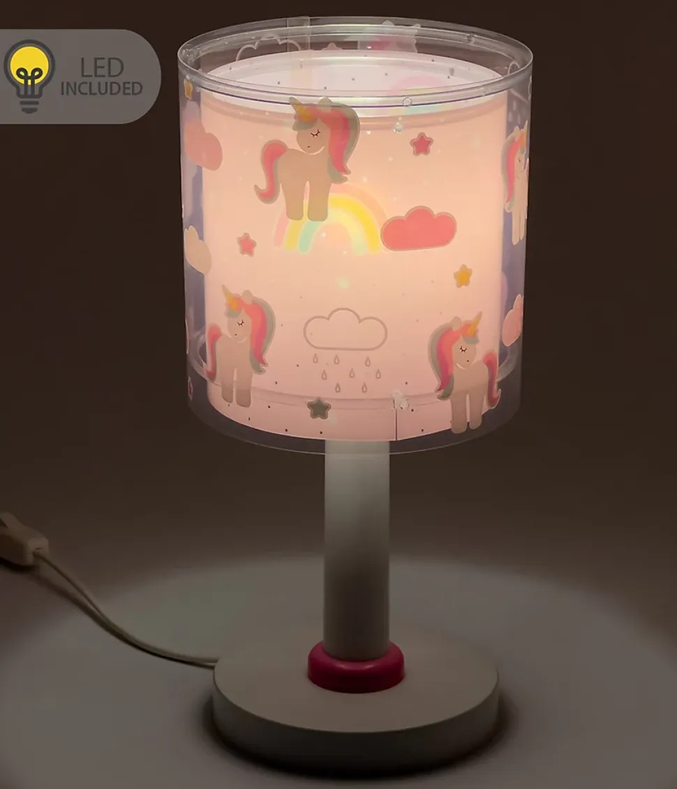 Lampe de chevet à imprimé licorne, composée d’un double abat-jour transparent rose, ces jolies licornes sont idéales pour décorer et éclairer la pièce.