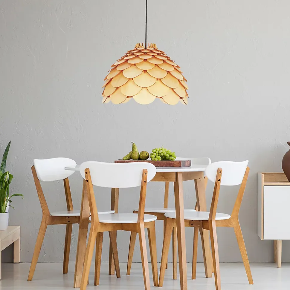 Burgo est une magnifique suspension imposante qui se distingue au premier regard par son design et son style uniques. Son abat-jour est en bois, plus précisément composé de plusieurs fines lamelles de bois superposées, évoquant une écorce d’ananas. Ce luminaire original trouvera parfaitement sa place dans une cuisine ou au-dessus d’une table à manger. Il offre une source de lumière unique et repose sur une structure métallique. La lampe est de couleur bois naturel. Elle s’harmonisera parfaitement avec les pièces à la décoration naturelle, champêtre ou bohème. Elle illuminera à coup sûr les espaces et créera une ambiance chaleureuse. Elle existe également en version plus petite, une excellente nouvelle pour celles et ceux qui rêvent d’une lampe Burgo mais pensaient ne pas pouvoir se l’offrir faute de place.