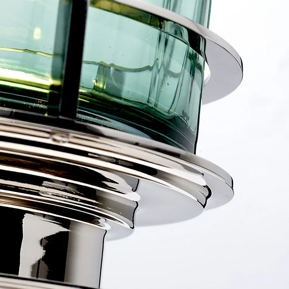 Lampe de table obélisque en verre soufflé avec une texture prismatique et une teinte verte. La source lumineuse est cachée dans la base avec de fins détails métalliques en nickel poli.