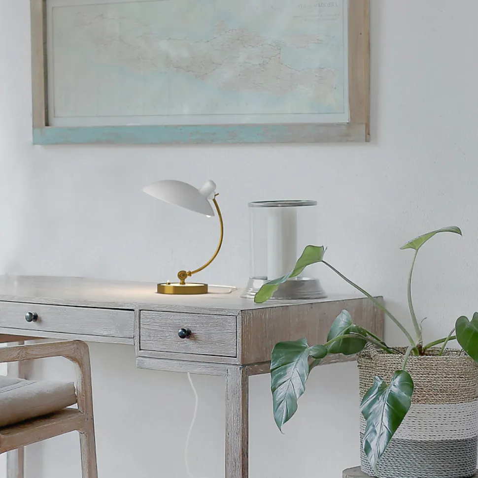 Lampe de Table « BOFA » – Inspirée par Fritz Hansen Kaiser Idell 6631, Finition en Noir Mat et Laiton, E27La lampe de table « MOFA » capture l’essence du design iconique des années 30 avec un style intemporel et raffiné. Inspirée par la lampe conçue par Christian Dell, son esthétique Bauhaus allie lignes épurées, géométrie précise et fonctionnalité.Caractéristiques principales :Design Bauhaus : Fusion de simplicité et d’élégance.Matériaux de haute qualité : Aluminium avec structure en laiton doré.Abat-jour orientable : Finition blanche ou noire avec revêtement intérieur blanc pour une lumière douce.Compatibilité : Compatible avec des ampoules LED E27 (G45 ou A60) non incluses.Interrupteur à la base : Câble de 1,3 m inclus.Idéale pour les bureaux, les coins lecture ou les tables d’appoint, elle apporte une touche contemporaine et sophistiquée à tout intérieur.