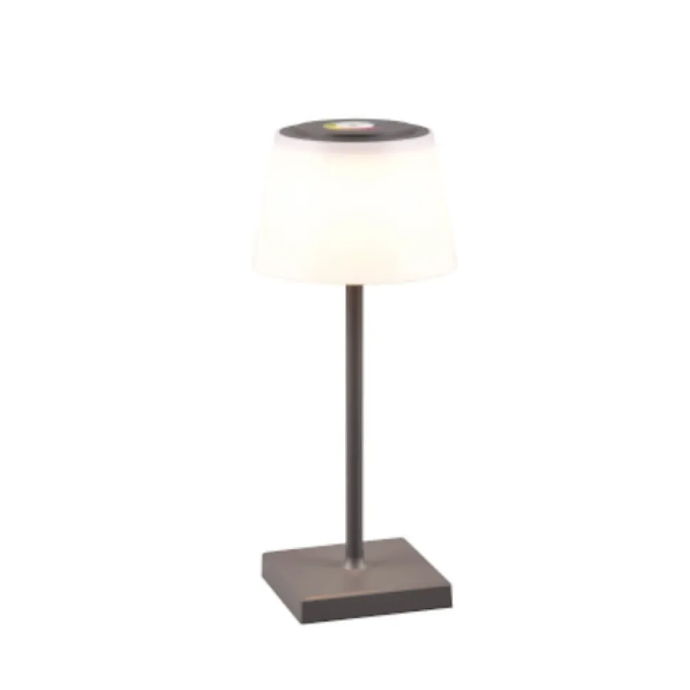 Les caractéristiques techniquesCette lampe de table Sanchez est en plastique anthracite et blanc.Elle est CCT en 3 étapes(3000+4000+5000K) et étanche (IP44).Elle peut éclairer en blanc ou en couleurs(RGBW).Elle est également dimmable en continu.Elle est rechargeable par cordon USB (fourni) et vous propose une autonomie de 6 heures pour un temps de charge de 5 heures.Vous pouvez l’utiliser en extérieur (IP44).Tout les réglages se font par bouton tactile.Les avantages esthétiquesSanchez s’intégrera parfaitement dans tous types d’extérieurs grâce a son design contemporain.Dimmable en continu, elle vous permet d’ajuster l’intensité lumineuse en fonction de l’ambiance souhaitée.Etanche, elle peut être utilisée à l’extérieur.Sanchezpermet de répondre à vos besoins d’éclairage en l’absence d’alimentation électrique à proximité.En usage professionnel, ce produit est idéal pour la terrasse d’un restaurant car vous pourrez éclairer efficacement vos tables sans installation électrique coûteuse.