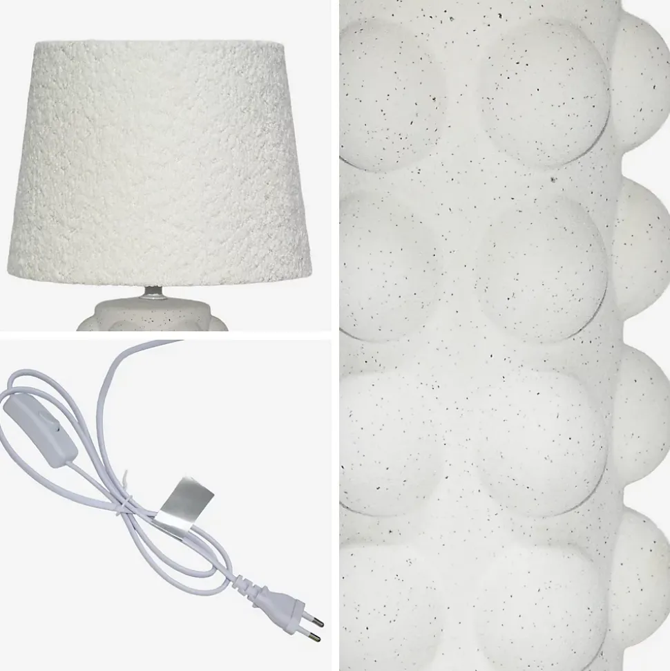 Les + produit :Joli pied cylindrique en céramiqueReliefs sphériquesMoucheté blanc et noirAbat-jour en boucletteImaginez un coin de votre salon doucement éclairé par la lampe Mia, sa lumière enveloppante créant une ambiance chaleureuse et accueillante. Son pied cylindrique en céramique, parsemé de boules délicates, apporte une touche sculpturale qui attire le regard sans jamais être imposante. L’abat-jour en bouclette diffuse une lueur douce et réconfortante, parfaite pour vos moments de lecture, vos soirées tranquilles ou simplement pour apporter une note originale à votre décoration. Information complémentaire : Compatibilité : Ampoule E27 (non fournie)Dimensions et caractéristiques :Coloris : BlancMatière : Pied en céramique / Abat-jour en boucletteDimensions : Ø22,5 x 44,5 cm (Pied : Ø14 x 22,5cm et abat-jour : Ø25,5 x 18,7cm)Câble de 1.2 m avec bouton on/off à 50 cm du pied de couleur blanc Compatible avec les ampoules E27 (non fournies) max 60WCapacité secteur max de 220-240 VFréquence : 50HzProtection : IP 20Poids net : 1,17kg