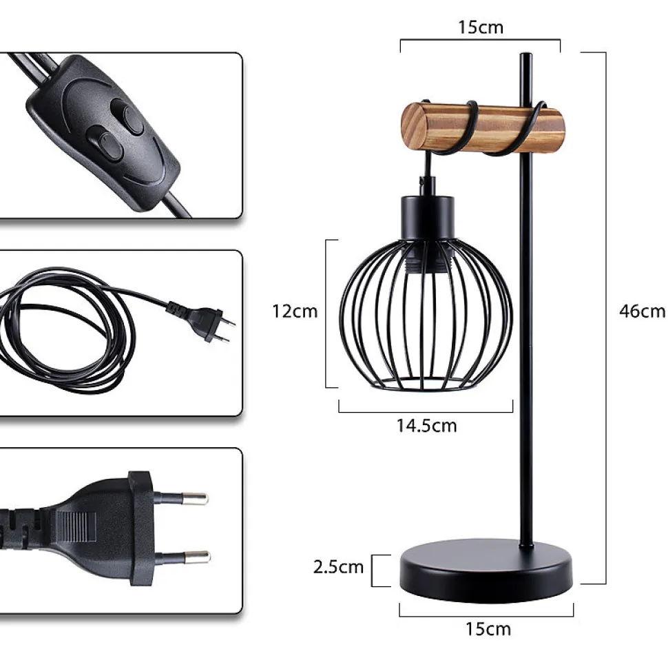 STYLE RÉTRO INDUSTRIEL CLASSIQUE : Cette lampe de table est fabriquée en bois massif sélectionné, traité à la flamme pour une texture de surface naturelle et unique, avec un abat-jour en métal noir qui souligne un style rétro industriel pur. La fusion d’éléments naturels et industriels sert à la fois d’éclairage et de décoration, ajoutant une texture unique à la pièce.COMPATIBLE AVEC LES SOURCES LUMINEUSES E27 : Cette lampe de table en bois est équipée d’une douille E27 standard, adaptée à une variété de sources lumineuses (jusqu’à 40 W), permettant de choisir une lumière chaude ou blanche selon l’ambiance. L’ampoule n’est pas incluse, vous permettant de choisir votre propre style d’éclairage.BASE ROBUSTE : Cette lampe de table noire est dotée d’une base en métal lestée pour assurer sa stabilité et l’empêcher de basculer facilement. Elle peut être placée sur diverses surfaces planes telles que bureaux, tables de chevet, tables d’appoint, etc., garantissant une plus grande sécurité au quotidien.FACILE À UTILISER : Dimensions : Base de la lampe : 15 x 2,5 cm ; Abat-jour : 14 x 14,7 cm ; Hauteur : 46 cm. Cette lampe de chevet est livrée avec un cordon d’alimentation et un interrupteur ; il suffit de la brancher et de l’utiliser. Facile à installer et à allumer, elle convient à tous les utilisateurs, simple et efficace.UTILISATIONS MULTIPLES : Lampe de chevet dans la chambre, lampe de lecture dans le bureau ou lampe décorative dans le salon, cette lampe de table s’intègre facilement à différents styles d’intérieur et crée une atmosphère chaleureuse et conviviale.