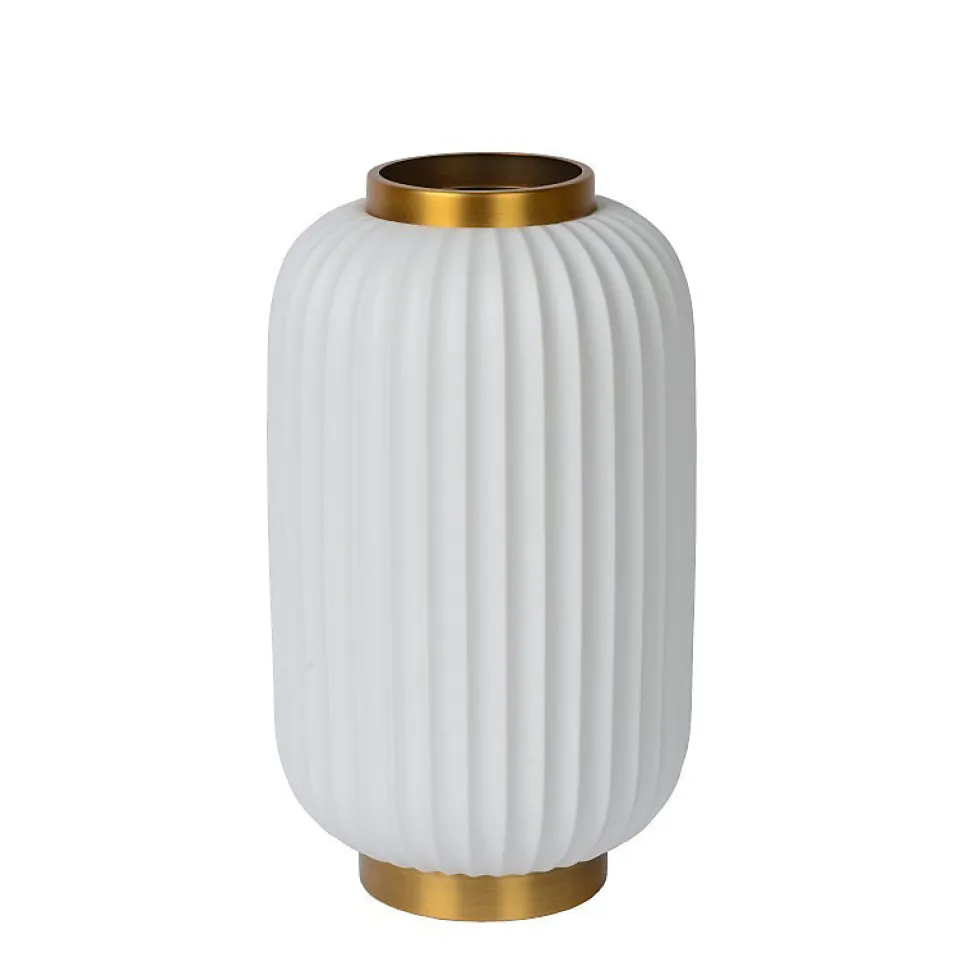 Les caractéristiques techniquesCette lampe de table de forme cylindrique est en porcelaine blanche cerclée de métal doré.La lumière se diffuse d’une part à travers l’enveloppe nervurée et d’autre part depuis la partie supérieure ouverte.La lampe Gosse fonctionne avec 1 ampoule E14, non fournie ce qui vous permet de choisir la température de couleur et l’intensité lumineuse souhaitées.Les avantages esthétiquesVous apprécierez l’esthétique raffinée et rétro de la lampe Gosse de la maison Lucide, spécialiste belge du luminaire depuis plus de 25 ans.Avec son pied en porcelaine blanche cerclé de métal doré, elle rappelle les lanternes japonaises et se mariera aussi bien à un intérieur contemporain qu’à du mobilier des années 30.L’ampoule diffusera une douce lumière en transparence pour une ambiance cocooning.Ce luminaire trouvera idéalement sa place sur une sellette dans votre salon, sur une table basse ou un meuble d’appoint ou pourra être utilisée en tant que lampe de chevet.