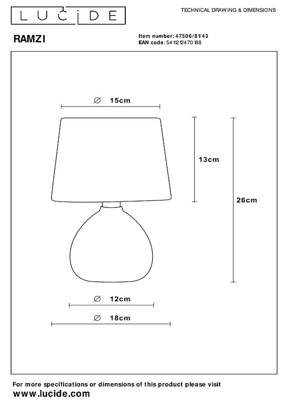 Des tons apaisants, des matières naturelles et une forme élégante. Vous pourrez retrouver toutes ces caractéristiques dans cette lampe de table compacte. Avec une hauteur de 26 centimètres, Ramzi, c’est ainsi que cette lampe se nomme, saura trouver sa place sur n’importe quelle table. Comme un éclairage d’ambiance lorsque vous regardez la télévision ou comme lampe de lecture pour votre livre le soir : la lumière est diffusée uniformément vers le haut et vers le bas. Vous pourrez profiter d’un design rustique en céramique de haute qualité. Vous pourrez allumer et éteindre Ramzi avec l’interrupteur sur le cordon. Disponible en différentes couleurs.Caractéristiques uniques:• Utilisable avec une source lumineuse LED• Avec un interrupteur On/off sur le câble• Fabriqué en céramiquePrincipales caractéristiques du produit:• Consommation énergétique: 1x40W / 230V / Sans intensité variable (Ampoule non incluse)• Dimensions: Ø18 cm Haut.26 cm• 2 Ans garantie sur le luminaire / source de lumière appropriée est EAN: 5411212490766Pourquoi choisir l’éclairage Lucide?Lucide incarne un design innovant, un savoir-faire artisanal et une fiabilité exemplaire. En tant qu’entreprise familiale belge avec plus de trois décennies d’expertise, nous concevons des éclairages de haute qualité qui enrichissent et transforment chaque espace, tant intérieur qu’extérieur. Notre collection polyvalente comprend des luminaires durables et des sources lumineuses économes en énergie, soigneusement conçus par nos propres experts et fabriqués selon les normes CE les plus strictes. Grâce à notre large gamme, nous vous proposons toujours une solution d’éclairage adaptée, quel que soit le style ou l’espace. Ainsi, nous illuminons non seulement votre espace de vie mais aussi votre processus de choix dans la recherche d’un éclairage de qualité et abordable. Chez Lucide, nous combinons innovation et savoir-faire pour un éclairage q…