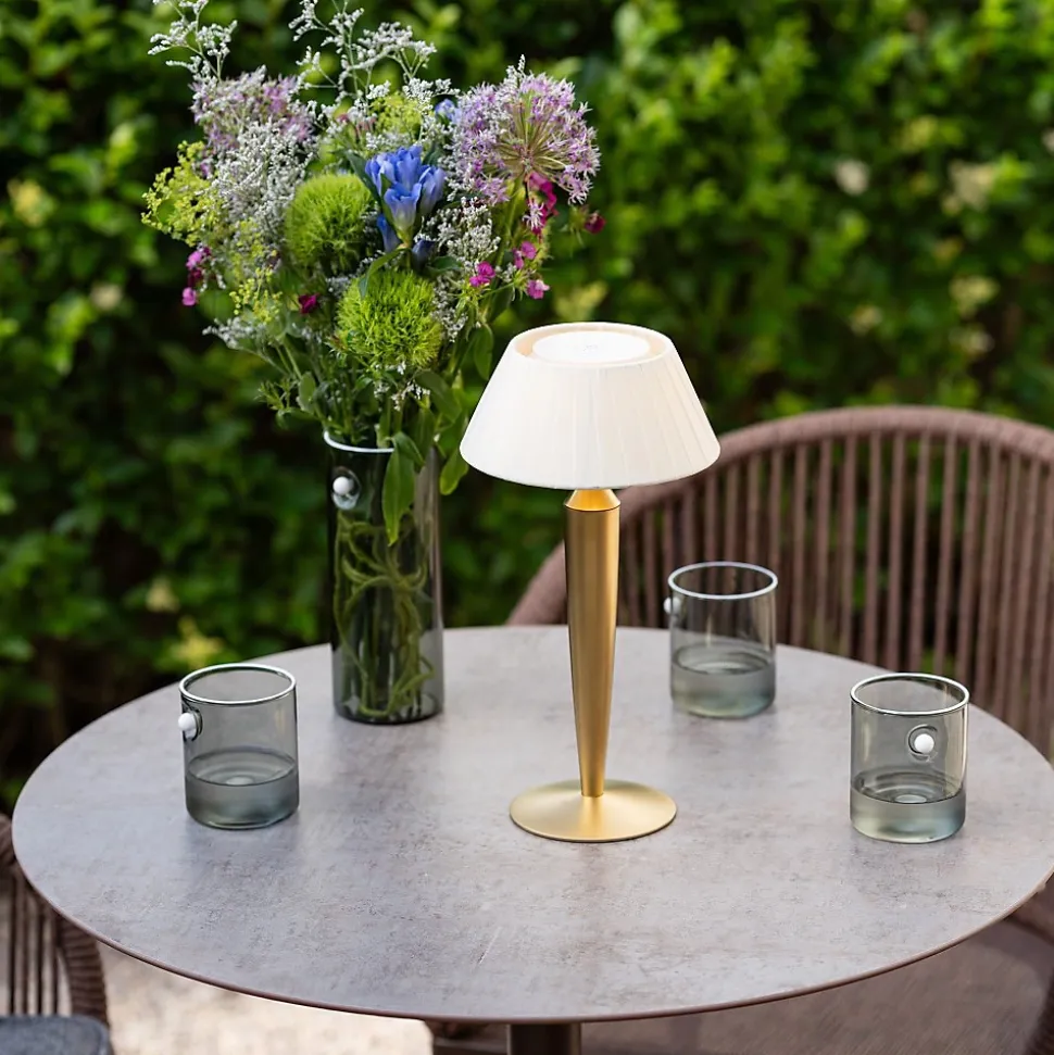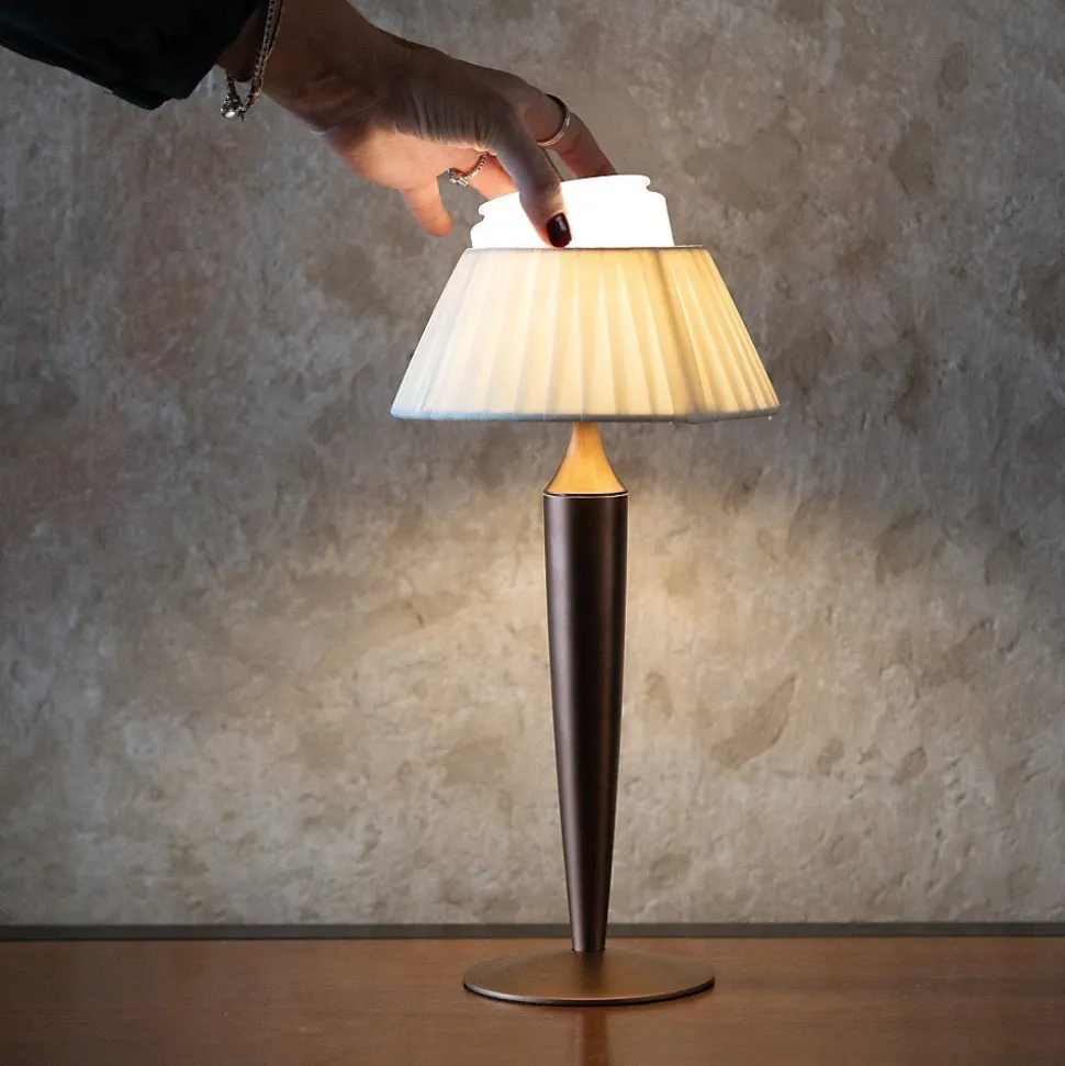 Flaminia de Zafferano est une lampe de table LED rechargeable qui allie la chaleur d’un design classique à l’efficacité de la technologie moderne. Conçue exclusivement pour les intérieurs, elle est idéale pour créer des atmosphères intimes, élégantes et accueillantes dans les maisons, les restaurants ou les hôtels de charme.La structure est en aluminium peint, l’abat-jour en tissu plissé et le module lumineux en polycarbonate opale diffuse une lumière chaude et enveloppante. Le système de commande tactile permet d’allumer et d’éteindre la lampe, de régler l’intensité et de choisir entre trois températures de couleur : 2200 K, 2700 K et 3000 K. L’angle de diffusion de 98 ° assure un éclairage doux et bien réparti.Le module LED est amovible et se recharge facilement grâce à la base de contact incluse. La batterie au lithium de 5200 mAh offre jusqu’à 10 heures d’autonomie à intensité maximale et se recharge complètement en environ 5 heures. La batterie est remplaçable, tandis que le bloc d’alimentation mural est disponible séparément.Disponible en finitions or mat et bronze, Flaminia est parfaite pour tout espace nécessitant une touche d’élégance sans sacrifier la praticité d’une lampe sans fil.Spécifications techniquesPuissance totale : 3,5 WLuminosité de la lampe : 205 / 209 / 225 lmTempérature de couleur : 2200 K / 2700 K / 3000 Kclasse énerg. de la source : GVariateur : variateurAlimentation : 5 Vdc max. 2 AAutonomie : jusqu’à 10 heuresTemps de charge : environ 5 heuresIndice de protection : IP20 (usage intérieur)La base de chargement est incluse dans l’emballage, mais pas le chargeur de batterie avec entrée USB Type-C