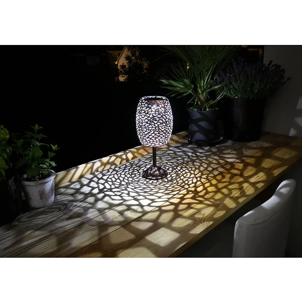 Lampe solaire d’extérieur au style vintage en métal cuivré, avec LED blanche intégrée de 10 lumens et motif ajouré décoratif. Panneau solaire 0,036 W, batterie Ni‑MH remplaçable 1 x 400 mAh (AA) offrant jusqu’à 8 heures d’autonomie après charge complète. Indice IP44, fournie prête à l’emploi, idéale pour jardin, terrasse et espaces extérieurs exposés au soleil. Garantie pièces 7 ans.