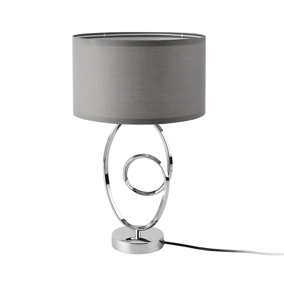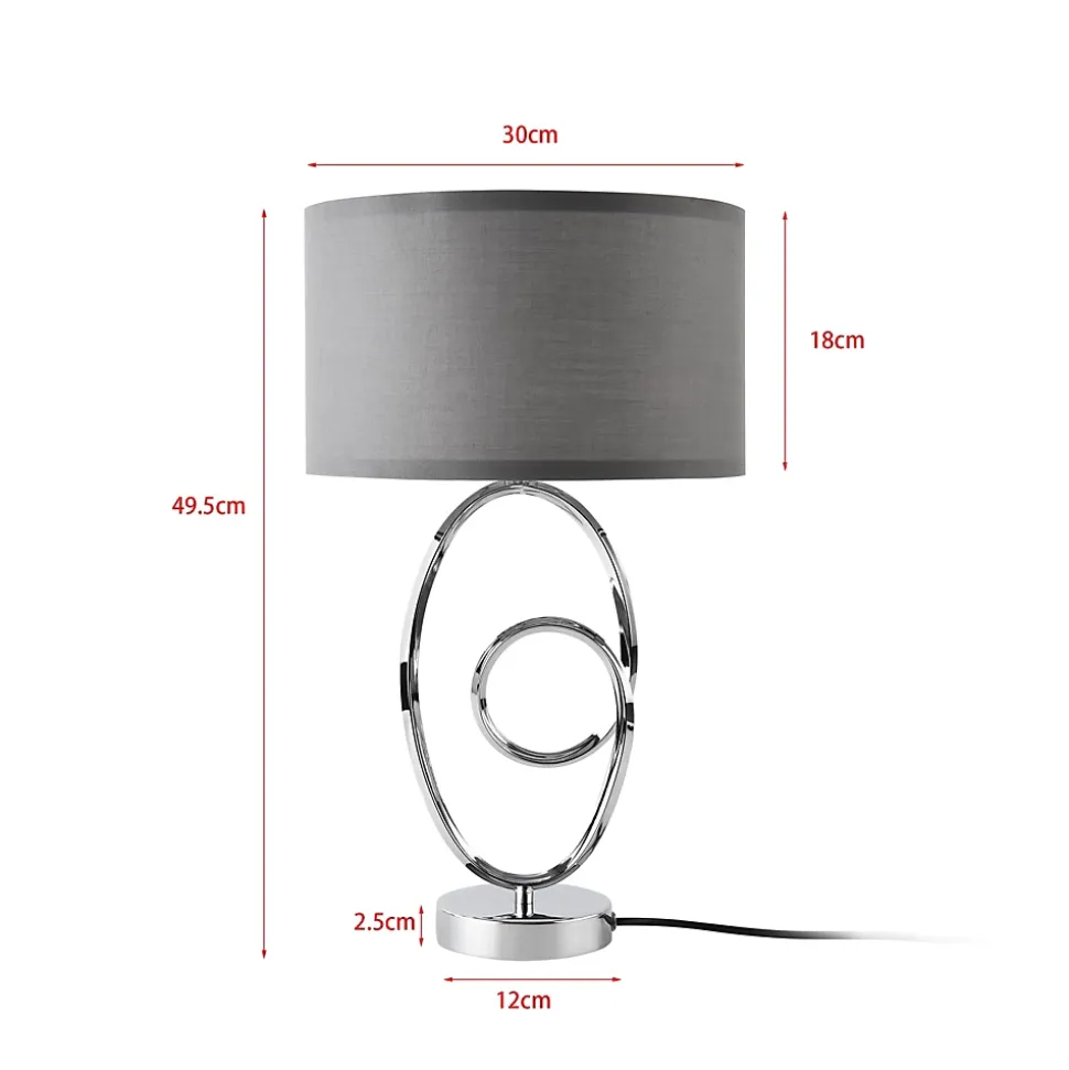 Lampe de tableNotre lampe de bureau au style unique et intemporel complétera parfaitement le décor de votre salon, chambre ou bureau. Elle apportera une ambiance chaleureuse à votre intérieur et s’adaptera facilement à tous les styles d’intérieur.Description :- lampe de table moderne et sophistiqué- idéale pour toutes pièces de la maison- design unique et attrayant- avec une douille de lampeCaractéristiques techniques :- Douille : 1 x E14, max. 40W (livraison sans ampoule)- Alimentation : 230V, 50Hz- interrupteur à cordonMatière :- structure : métal- abat-jour : tissu (100 % polyester)Dimensions :- hauteur : 49,5 cm- abat-jour (diamètre x hauteur) : 30 x 18 cm- pied (diamètre x hauteur) : 12 x 2,5 cm- longueur du câble : 150 cmCouleur :- structure : chrome- abat-jour : grisContenu de la livraison :1 x lampe de table (l’ampoule ne fait pas partie de l’offre)Produit de la marque :lux.pro