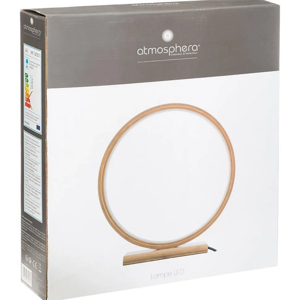 Tantôt naturelle tantôt avant-gardiste, la lampe LED « Stela » Atmosphera charme par sa forme épurée et son intensité lumineuse.Un style uniqueLa lampe LED « Stela » Atmospera consiste en un simple cercle de bois de bambou posé sur un socle du même matériau et souligné par une ruban LED circulaire. On aime son esprit très contemporain et sa conception simple et élégante, qui convient à toutes les pièces de la maison.La chaleur du bambouCette lampe en bois de bambou apporte beaucoup de chaleur à la décoration d’une pièce. Son ruban LED intégré se compose de petites diodes qui offrent une luminosité agréable et tamisée. Grâce à sa longue durée de vie, vous n’avez pas à prévoir de remplacement.Une console Atmosphera en bois clair, un chevet industriel, une simple étagère… Cette lampe se prête à toutes vos envies déco avec polyvalence.Le petit plus décoAvec sa teinte chaude et naturelle, le bambou est le bois parfait dans un intérieur d’inspiration scandinave, bohème ou exotique.