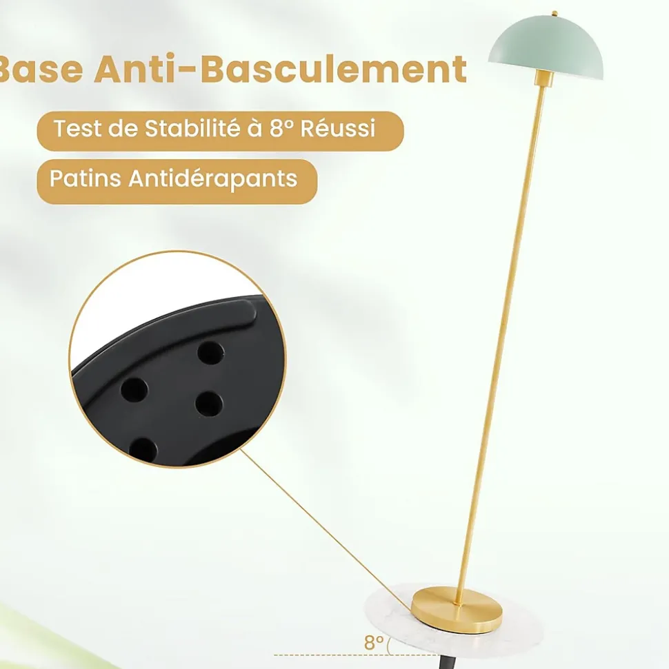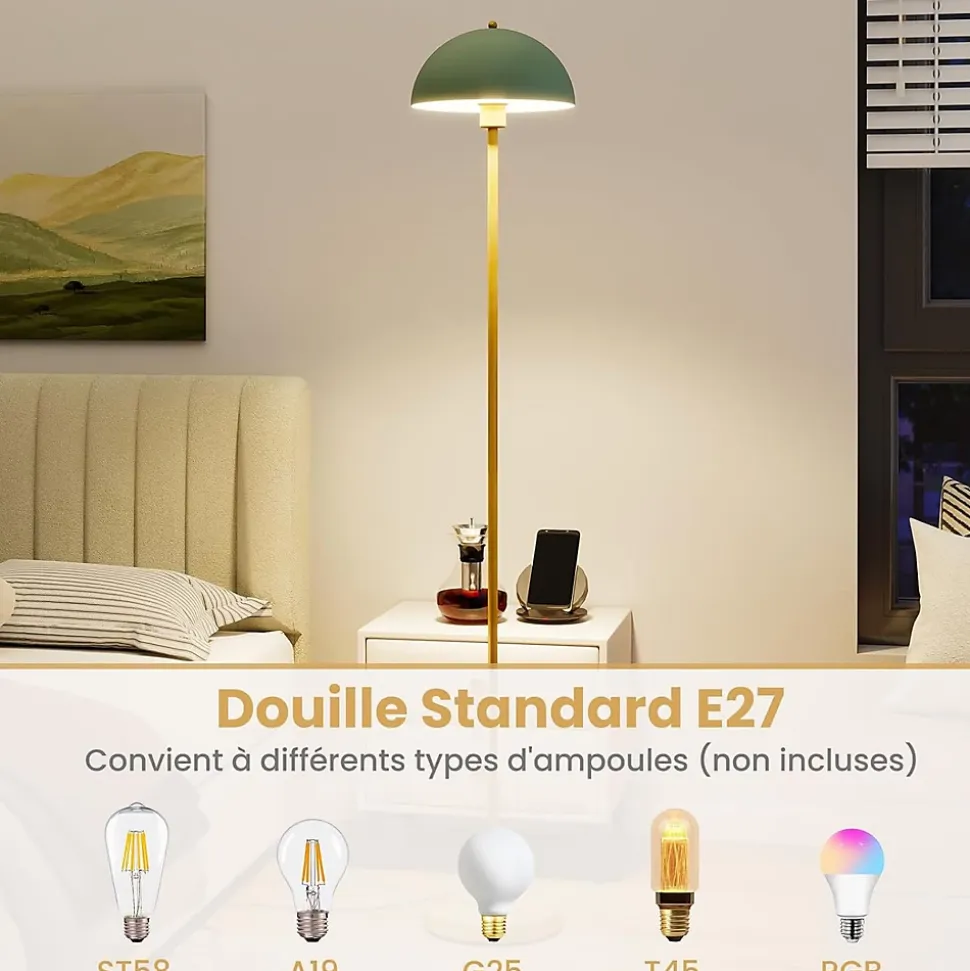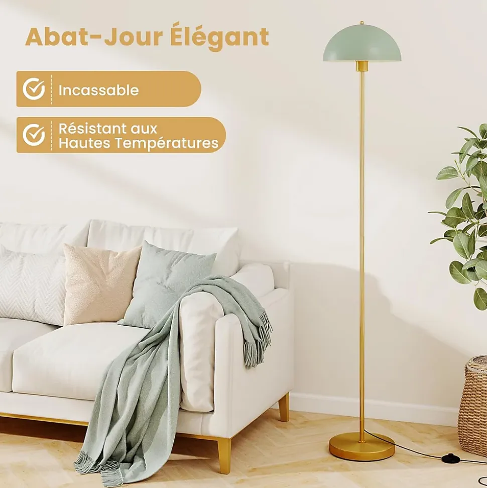 Ce lampadaire moderne vous accompagne pendant vos moments de lecture. Lorsque vous êtes prêt à profiter de votre temps de lecture sur le canapé, appuyez sur l’interrupteur au pied et laissez la lampe s’allumer. La lumière douce ne fatiguera pas vos yeux. La douille E27 vous permet de choisir parmi une large gamme d’ampoules (non incluses) jusqu’à 60 W. La base lestée garantit une grande stabilité, et le trou de la base réduit son poids afin qu’elle ne se déforme pas sous l’effet de la gravité. L’esthétique est tout aussi impressionnante : l’abat-jour vert et la base dorée ajoutent une touche moderne à votre intérieur.