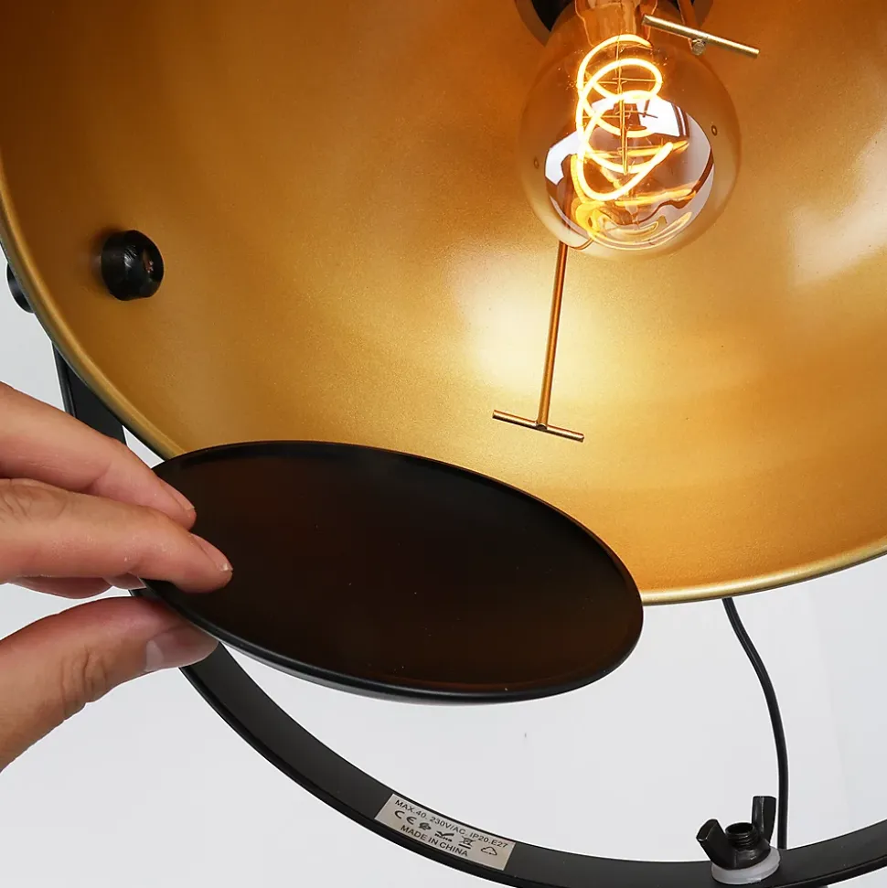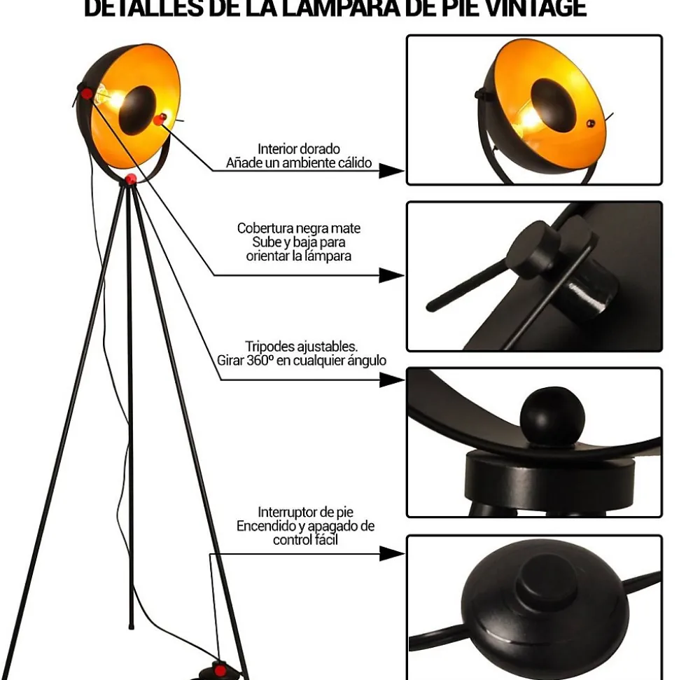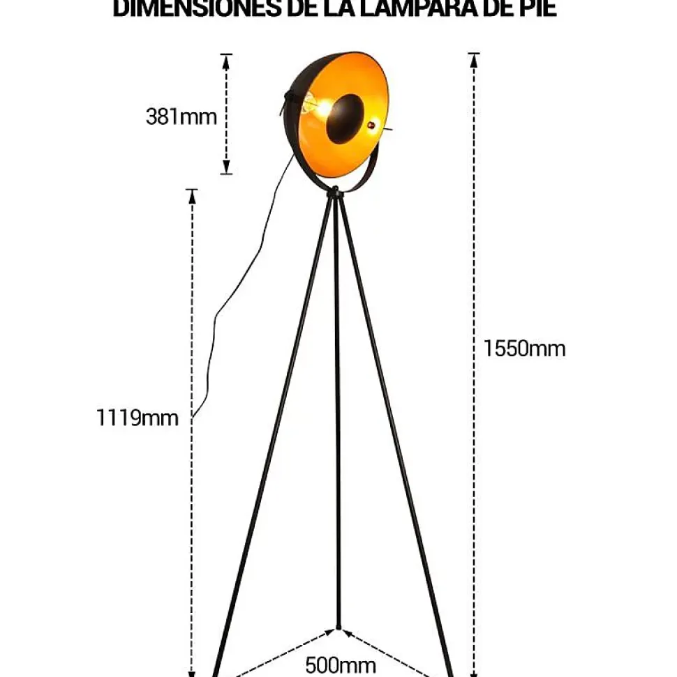 Design Polyvalent : Idéale pour n’importe quelle pièce intérieure, la lampe sur pied « »BERLIN » » ajoute une touche moderne et élégante à votre maison.Tête Orientable : Sa tête dorée est entièrement orientable, offrant un angle de 360 degrés pour diriger la lumière là où vous en avez le plus besoin.Style Vintage : Avec son corps en aluminium noir mat et son trépied à trois pieds, cette lampe sur pied dégage un charme vintage qui complète votre décoration.Dimensions Ajustées : Avec une hauteur totale de 1550 mm et un diamètre de tête de 32 cm, les dimensions sont idéales pour décorer votre espace.Douille E27 : Fonctionne avec des ampoules E27 jusqu’à 60W (non incluses), vous permettant de personnaliser l’éclairage selon vos préférences.Description : La lampe sur pied « »BERLIN » » marie style et fonctionnalité avec son design moderne et sa tête orientable. Son corps en aluminium noir mat et son trépied à trois pieds ajoutent une touche vintage à n’importe quel espace intérieur. Idéale pour les salons ou les grandes pièces, cette lampe sur pied se distingue par son élégance et sa capacité à s’adapter à différents styles de décoration.Fiche Technique :Tension : 230V.Puissance maximale : 60W.Douille : E27.Dimensions : 500x1550mm.Diamètre de la tête orientable : 320mm.Indice de protection : IP20.Facile à installer et à orienter.Fonctionne avec une ampoule E27. Non incluse. »