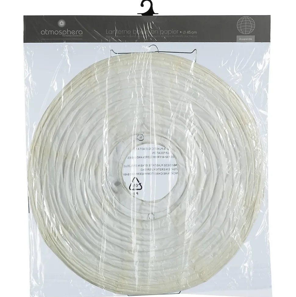 Apportez de la douceur à votre décoration avec la lanterne boule Blanche D45 d’Atmosphera.La lanterne blanche mesure 45 cm de diamètre pour 85 g.Cette lanterne est fabriquée en papier et possède une structure en fer.Vous pourrez l’utiliser aussi bien à l’intérieur qu’à l’extérieur pour apporter une touche bohème chic à votre décoration.Retrouvez dans le même style la lanterne LED Couleurs vives D25.