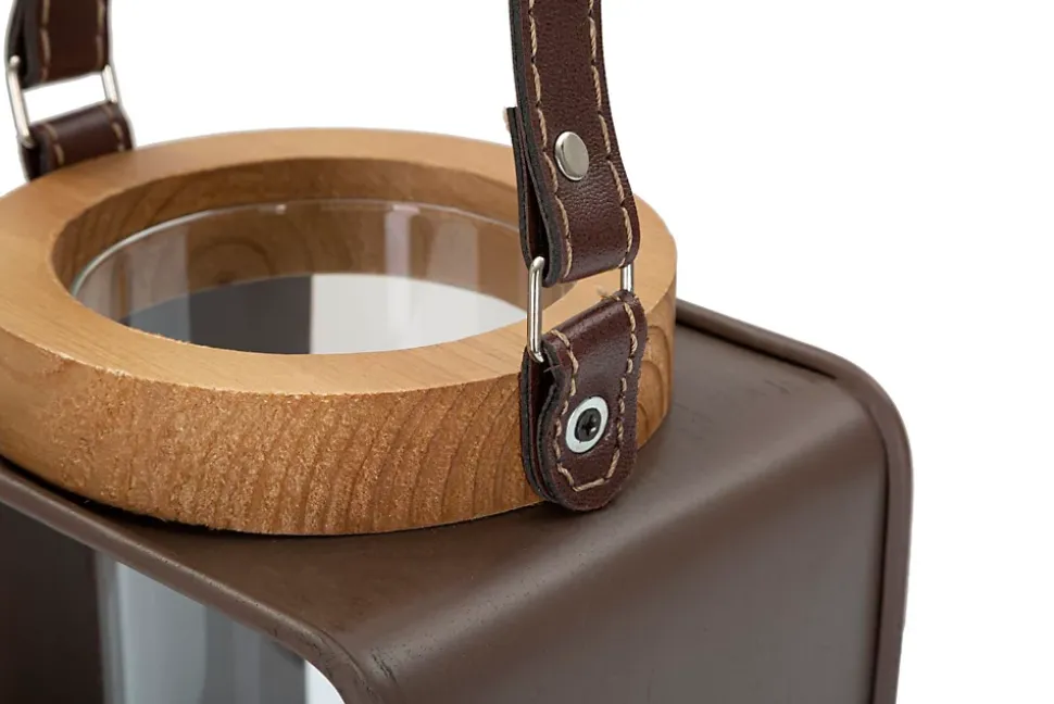 Lanterne simple en métal et bois avec bougeoir en verre. Livrée avec une sangle de suspension. Dimensions : 16 x 13 x 18,5 cm.