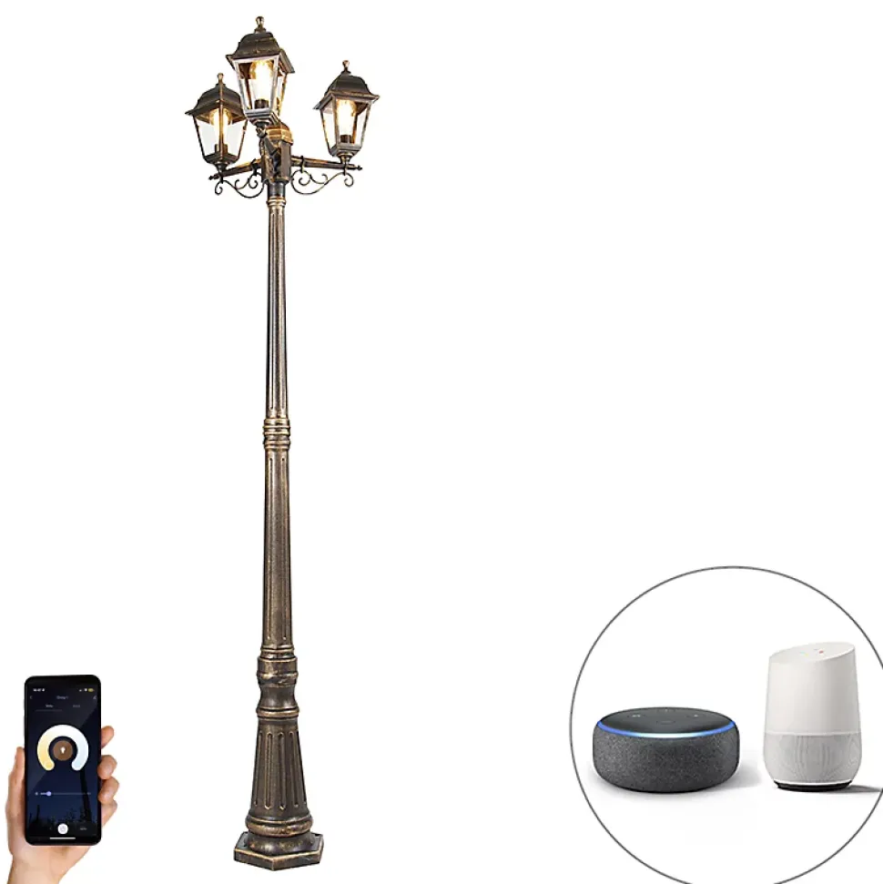 La lanterne sur pied Capital est un classique parmi les lampes d’extérieur ! Elle a reçu un nouveau look car elle est livrée avec 3 sources lumineuses Wifi intelligentes. Celles-ci ont un rendement lumineux de 320 lumens et 2500 Kelvin. Vous pouvez contrôler l’éclairage via votre smartphone, votre tablette ou votre assistant domestique. Grâce à sa valeur IP44, la Capital est résistante aux éclaboussures et convient au jardin. Elle est faite de plastique avec du verre et finie en laiton. Cette lampe d’extérieur classique ne devrait pas manquer dans votre jardin !
