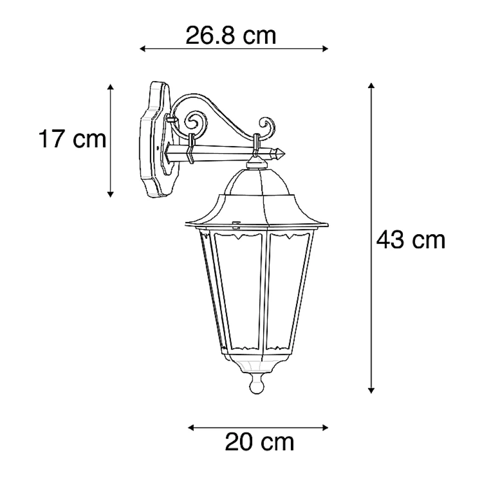 Prêt à donner du style à votre mur ou façade extérieure avec cette magnifique lanterne murale classique ? Alors, profitez dès maintenant de la New Orleans Down ! Cette lanterne murale a un look élégant et raffiné qui donnera à votre maison un style classique. Elle mesure 20 cm de long, 43 cm de haut et 26,8 cm de profondeur. La plaque de montage mesure 12 cm de long, 17 cm de haut et 26,8 cm de profondeur. La lanterne murale est livrée sans ampoule E27, commandez donc une belle ampoule d’une puissance maximale de 60 watts et laissez votre jardin briller. La lanterne murale est compatible avec un variateur externe (non inclus). Avec un indice de protection IP44, cette lanterne murale est résistante aux éclaboussures. Complétez votre jardin avec cette magnifique lanterne murale !