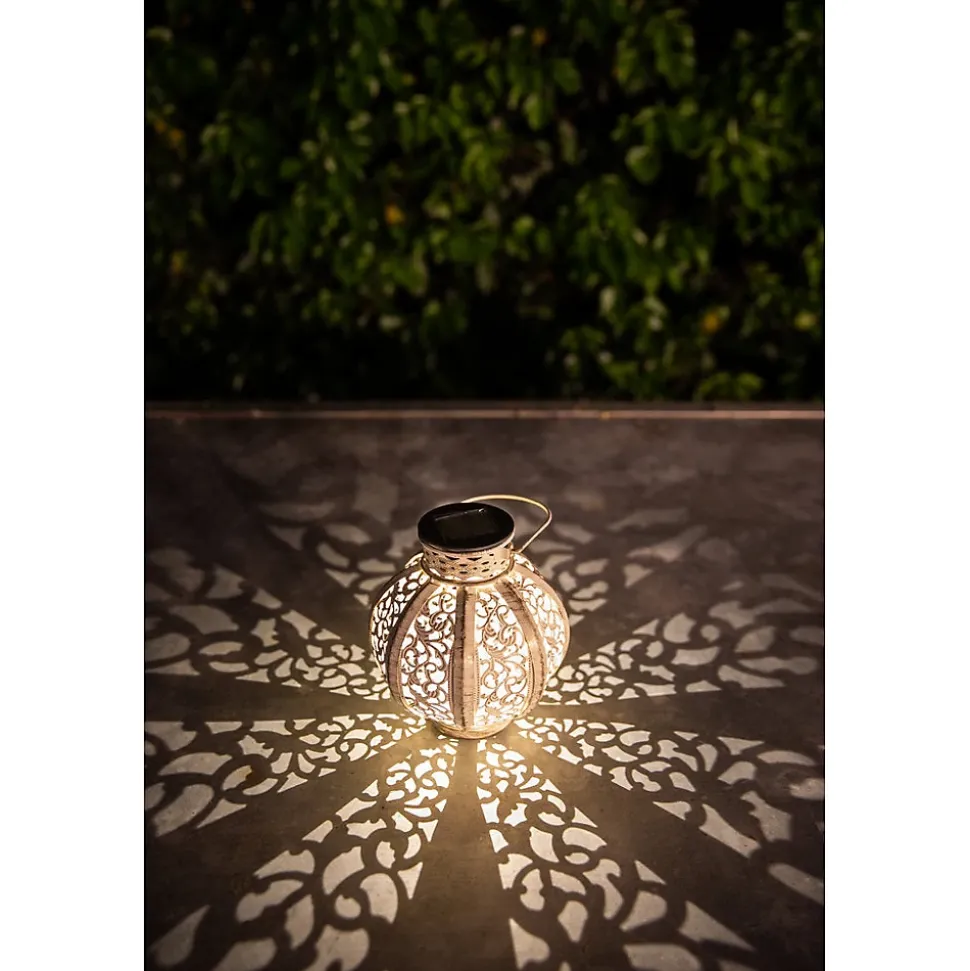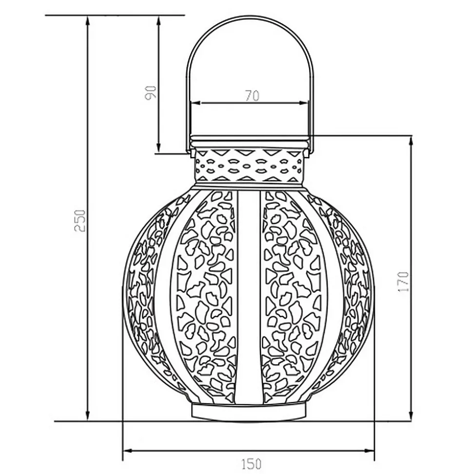 Décoration métal à énergie solaire – design vintageMatière : métalNombre de Lumens : 10Durée maximum d’éclairage : 8 heuresInterrupteur on/off LED : 1 LED blanche Batteries rechargeables : 1 x 400mAh Ni-Mh AAADimensions produits : (voir le schéma technique parmi les images)H : 250 / 170 mm – Ø 150 mm