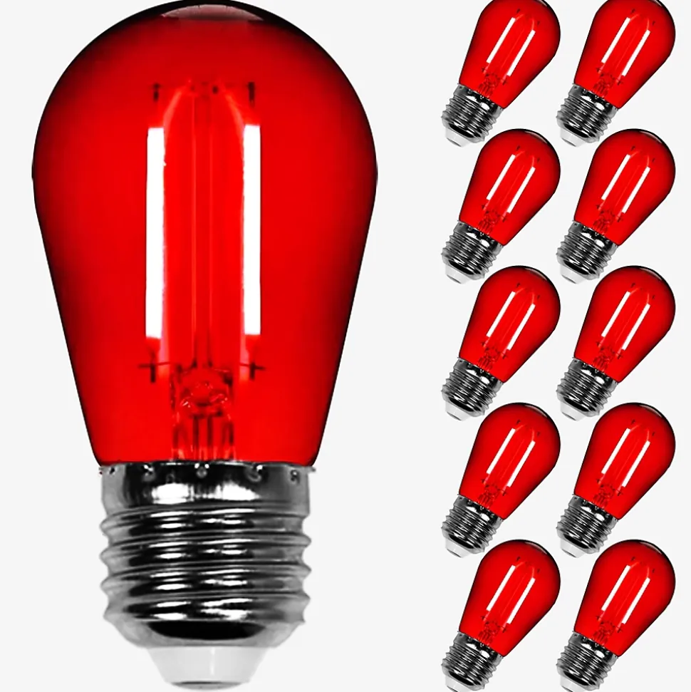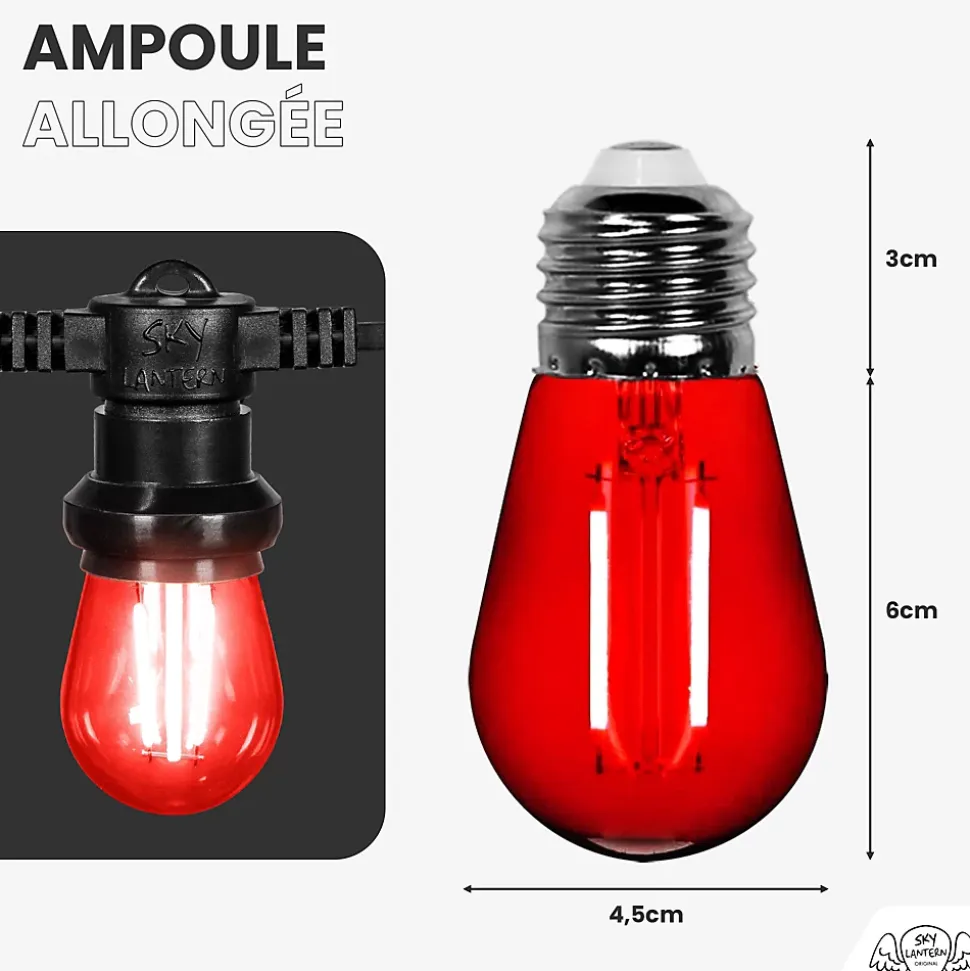 La touche vive et lumineuse indispensable à toute guirlandeAjoutez une touche de couleur à votre guirlande guinguette avec notre lot de 10 ampoules filament dimmable LED rouge de 5 cm de diamètre !Avec son culot E27, cette ampoule s’adaptera parfaitement à votre guirlande guinguette SkyLantern.En remplaçant une ampoule cassée ou en personnalisant votre guirlande avec les couleurs de votre choix, vous pourrez créer une ambiance unique pour vos soirées en plein air, votre mariage, vos fêtes de famille ou vos événements professionnels !N’attendez plus pour donner une touche de personnalité à votre guirlande guinguette, et optez pour notre lot de 10 ampoules filament dimmable LED rouge pour illuminer vos soirées en extérieur comme en intérieur !Caractéristiques Générales : Ampoule LED 2 W Diamètre : 5 cm Culot E27 Idéale pour nos guirlandes guinguette 10 ampoules