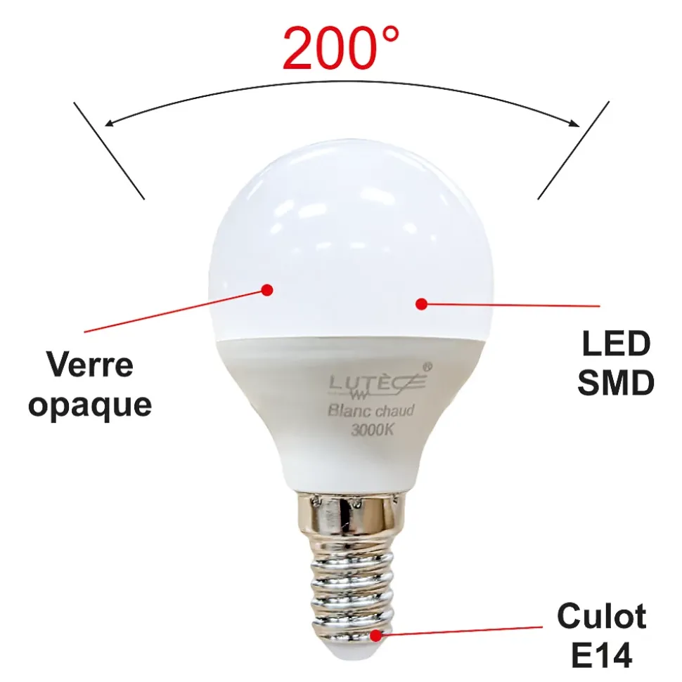 Des ampoules de haute qualité : CE et RoHS approuvés avec 5 ans de garantie.Des économies d’énergie significatives : économisez près de 90% sur votre facture d’électricité de l’éclairage en remplaçant vos ampoules à incandescence de 40 W par ces ampoules LED de 4,5 W.Une durée de vie extrêmement longue de 20 000 heures (vs 1 200 heures pour une ampoule à incandescence) pour un nombre de commutation garanti (ON/OFF) de 50 000.Un angle de faisceau large de 200 degrés, parfait pour un éclairage résidentiel et commercial.Il s’agit d’ampoules LED non réglables, non compatibles avec les variateurs de lumière.Une lumière de 330 lumens immédiatement, sans temps de chauffe pour atteindre son niveau d’éclairage maximal.Avec une température de couleur de 3 000 Kelvin, l’ampoule fournit une lumière blanc chaud, créant une atmosphère accueillante. Cette couleur d’éclairage est proche de la température d’une lumière produite par une ampoule incandescente ou une ampoule halogène.Applications : Les pièces dont le revêtement est clair et dans lesquelles vous souhaitez créer une ambiance chaleureuse ou obtenir un éclairage plus doux comme le salon, la salle à manger, la cuisine, les chambres.Caractéristiques techniques :Nombre d’ampoules : 10 piècesModèle : LEDForme : SphèriqueCulot : E14Type LED : SMDPuissance réelle : 4,5 WattEquivalence ampoule à incandescence : 30 WattLumen : 330 LmAncienne classe énergétique 2012 : A+Nouvelle classe énergétique 2021: GEconomie d’énergie : 90%Durée de vie : 20 000 heuresNombre de commutation (ON/OFF) : 50 000Variable / dimmable : nonAllumage : instantanéCouleur : blanc chaudTempérature (en kelvin) : 3 000 KAngle de diffusion : 200°Verre : opaqueDimensions : 45×82 mmTension : 220-240 VoltGarantie : 5 ansNormes : CE, RoHS