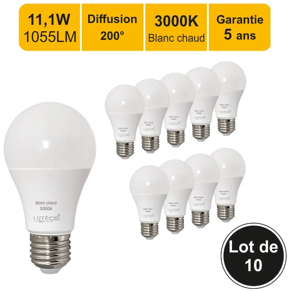 Des ampoules de haute qualité : CE et RoHS approuvés avec 5 ans de garantie.Des économies d’énergie significatives : économisez près de 90% sur votre facture d’électricité de l’éclairage en remplaçant vos ampoules à incandescence de 75 W par ces ampoules LED de 11,1 W.Une durée de vie extrêmement longue de 20 000 heures (vs 1 200 heures pour une ampoule à incandescence) pour un nombre de commutation garanti (ON/OFF) de 50 000.Un angle de faisceau large de 200 degrés, parfait pour un éclairage résidentiel et commercial.Il s’agit d’ampoules LED non réglables, non compatibles avec les variateurs de lumière.Une lumière de 1055 lumens immédiatement, sans temps de chauffe pour atteindre son niveau d’éclairage maximal.Avec une température de couleur de 3 000 Kelvin, l’ampoule fournit une lumière blanc chaud, créant une atmosphère accueillante. Cette couleur d’éclairage est proche de la température d’une lumière produite par une ampoule incandescente ou une ampoule halogène.Applications : Les pièces dont le revêtement est clair et dans lesquelles vous souhaitez créer une ambiance chaleureuse ou obtenir un éclairage plus doux comme le salon, la salle à manger, la cuisine, les chambres.Caractéristiques techniques :Nombre d’ampoules : 10 piècesModèle : LED standardForme : Standard A60Culot : E27Type LED : SMDPuissance réelle : 11,1 WattEquivalence ampoule à incandescence : 75 WattLumen : 1055 LmAncienne classe énergétique 2012 : A+Nouvelle classe énergétique 2021: FEconomie d’énergie : 90%Durée de vie : 20 000 heuresNombre de commutation (ON/OFF) : 50 000Variable / dimmable : nonAllumage : instantanéCouleur : blanc chaudTempérature (en kelvin) : 3 000 KAngle de diffusion : 200°Verre : opaqueDimensions : 60×112 mmTension : 220-240 VoltGarantie : 5 ansNormes : CE, RoHS