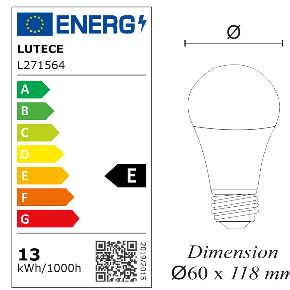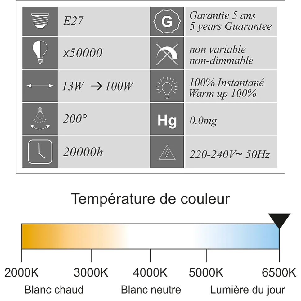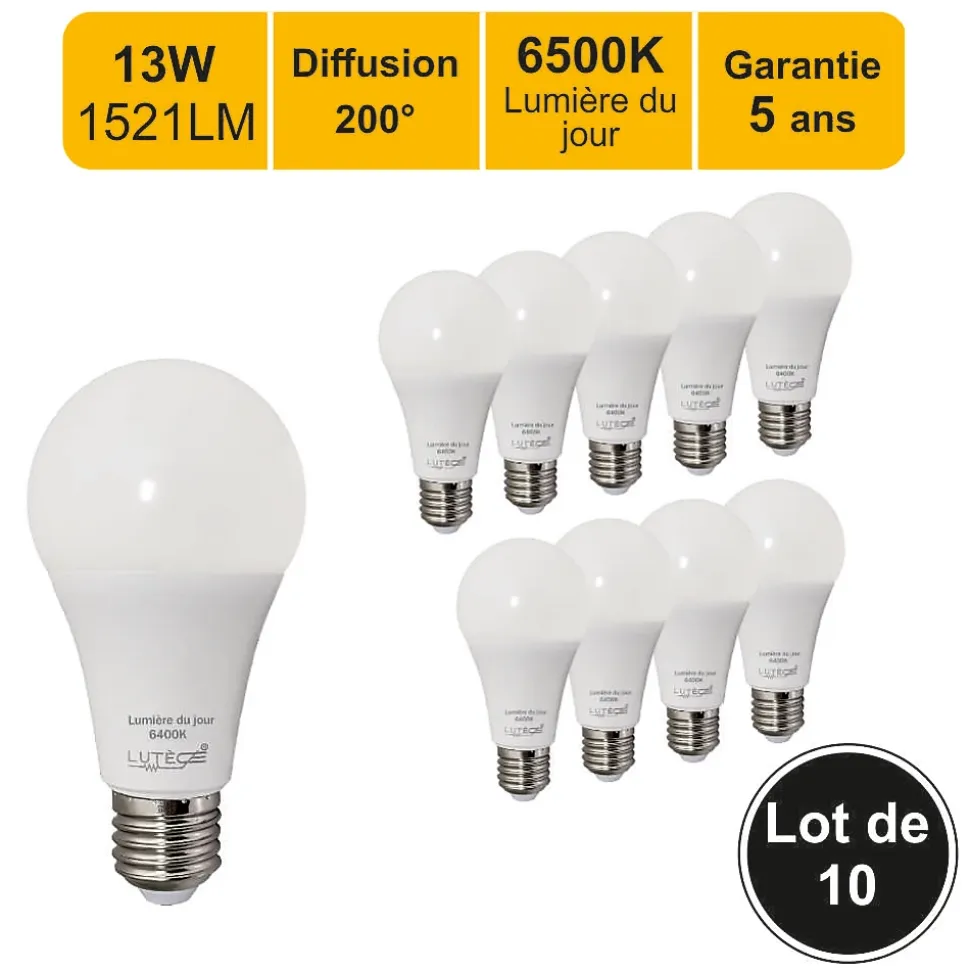 Des ampoules de haute qualité : CE et RoHS approuvés avec 5 ans de garantie.Des économies d’énergie significatives : économisez près de 90% sur votre facture d’électricité de l’éclairage en remplaçant vos ampoules à incandescence de 100 W par ces ampoules LED de 13 W.Une durée de vie extrêmement longue de 20 000 heures (vs 1 200 heures pour une ampoule à incandescence) pour un nombre de commutation garanti (ON/OFF) de 50 000.Un angle de faisceau large de 200 degrés, parfait pour un éclairage résidentiel et commercial.Il s’agit d’ampoules LED non réglables, non compatibles avec les variateurs de lumière.Une lumière de 1521 lumens immédiatement, sans temps de chauffe pour atteindre son niveau d’éclairage maximal.Avec une température de couleur de 6500 Kelvin, l’ampoule fournit une lumière du jour, créant une atmosphère accueillante. Cette couleur d’éclairage est proche de la température d’une lumière produite par une ampoule incandescente ou une ampoule halogène.Applications : Les pièces dont le revêtement est clair et dans lesquelles vous souhaitez créer une ambiance chaleureuse ou obtenir un éclairage plus doux comme le salon, la salle à manger, la cuisine, les chambres.Caractéristiques techniques :Nombre d’ampoule : 10 pièceModèle : LED standardForme : Standard A60Culot : E27Type LED : SMDPuissance réelle : 13 WattEquivalence ampoule à incandescence : 100 WattAncienne classe énergétique : A+Nouvelle classe énergétique : EEconomie d’énergie : 90%Durée de vie : 20 000 heuresNombre de commutation (ON/OFF) : 50 000Variable / dimmable : nonAllumage : instantanéCouleur : blanc chaudTempérature (en kelvin) : 6500 KLumen : 1521 LmAngle de diffusion : 200°Verre : opaqueDimensions : 60×118 mmTension : 220-240 VoltGarantie : 5 ansNormes : CE, RoHS