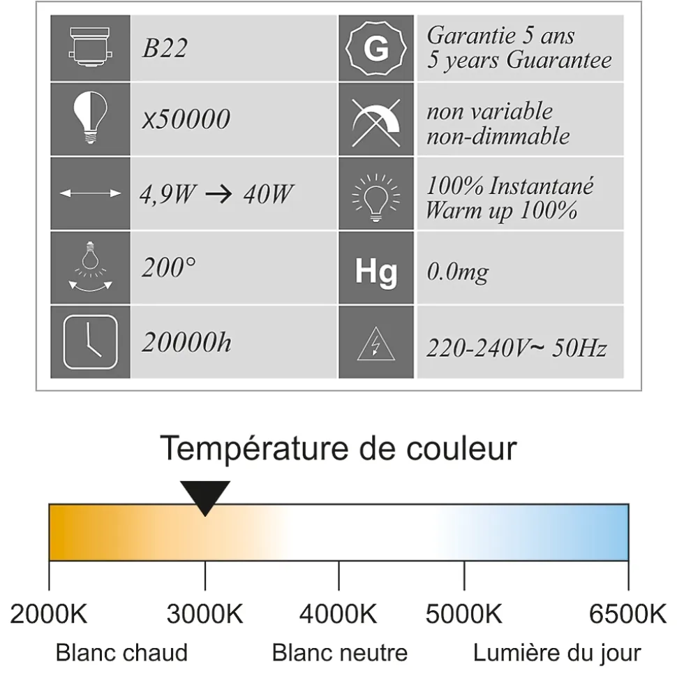 Des ampoules de haute qualité : CE et RoHS approuvés avec 5 ans de garantie.Des économies d’énergie significatives : économisez près de 90% sur votre facture d’électricité de l’éclairage en remplaçant vos ampoules à incandescence de 30 W par ces ampoules LED de 4,5 W.Une durée de vie extrêmement longue de 20 000 heures (vs 1 200 heures pour une ampoule à incandescence) pour un nombre de commutation garanti (ON/OFF) de 50 000.Un angle de faisceau large de 200 degrés, parfait pour un éclairage résidentiel et commercial.Il s’agit d’ampoules LED non réglables, non compatibles avec les variateurs de lumière.Une lumière de 330 lumens immédiatement, sans temps de chauffe pour atteindre son niveau d’éclairage maximal.Avec une température de couleur de 3 000 Kelvin, l’ampoule fournit une lumière blanc chaud, créant une atmosphère accueillante. Cette couleur d’éclairage est proche de la température d’une lumière produite par une ampoule incandescente ou une ampoule halogène.Applications : Les pièces dont le revêtement est clair et dans lesquelles vous souhaitez créer une ambiance chaleureuse ou obtenir un éclairage plus doux comme le salon, la salle à manger, la cuisine, les chambres.Caractéristiques techniques :Nombre d’ampoules : 10 piècesModèle : LEDForme : SphériqueCulot : E27Type LED : SMDPuissance réelle : 4,5 WattEquivalence ampoule à incandescence : 30 WattLumen : 330 LmAncienne classe énergétique 2012 : A+Nouvelle classe énergétique 2021: GEconomie d’énergie : 90%Durée de vie : 20 000 heuresNombre de commutation (ON/OFF) : 50 000Variable / dimmable : nonAllumage : instantanéCouleur : blanc chaudTempérature (en kelvin) : 3 000 KAngle de diffusion : 200°Verre : opaqueDimensions : 45×82 mmTension : 220-240 VoltGarantie : 5 ansNormes : CE, RoHS