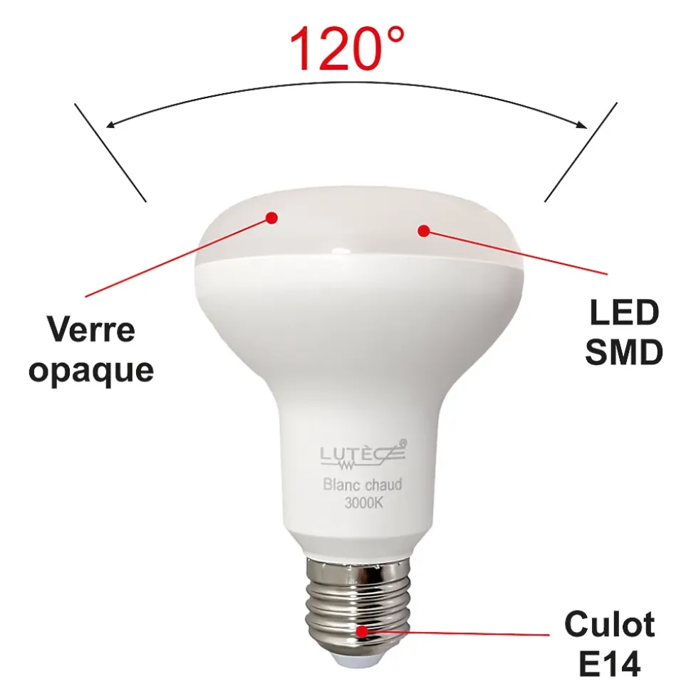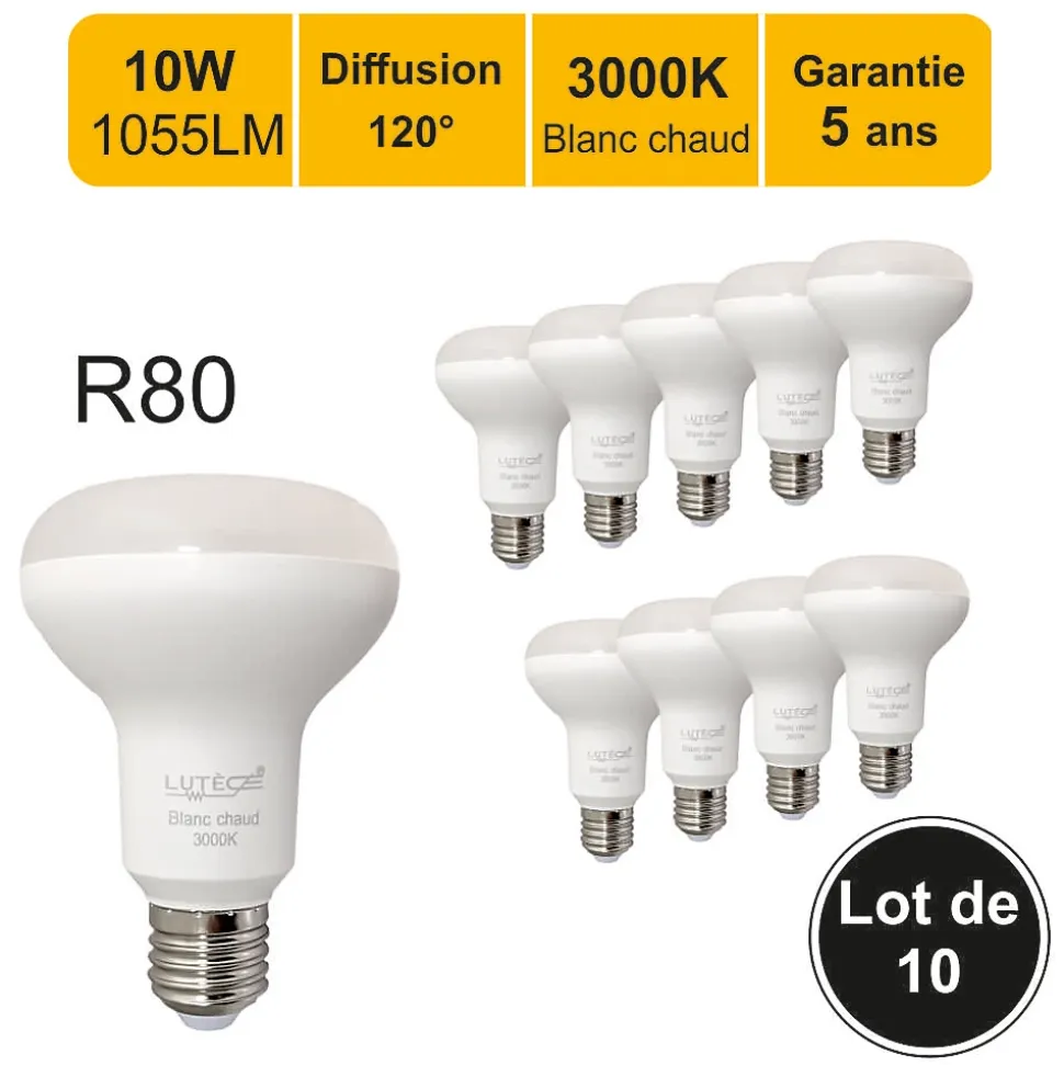 Des ampoules de haute qualité : CE et RoHS approuvés avec 5 ans de garantie.Des économies d’énergie significatives : économisez près de 90% sur votre facture d’électricité de l’éclairage en remplaçant vos ampoules à incandescence de 75 W par ces ampoules LED de 10W.Une durée de vie extrêmement longue de 20 000 heures (vs 1 200 heures pour une ampoule à incandescence) pour un nombre de commutation garanti (ON/OFF) de 50 000.Un angle de faisceau large de 120 degrés, parfait pour un éclairage résidentiel et commercial.Il s’agit d’ampoules LED non réglables, non compatibles avec les variateurs de lumière.Une lumière de 1055 lumens immédiatement, sans temps de chauffe pour atteindre son niveau d’éclairage maximal.Avec une température de couleur de 3 000 kelvin, l’ampoule fournit une lumière blanc chaud, créant une atmosphère accueillante. Cette couleur d’éclairage est proche de la température d’une lumière produite par une ampoule incandescente ou une ampoule halogène.Applications : Les pièces dont le revêtement est clair et dans lesquelles vous souhaitez créer une ambiance chaleureuse ou obtenir un éclairage plus doux comme le salon, la salle à manger, la cuisine, les chambres.Caractéristiques techniques :Nombre d’ampoules : 10 piècesModèle : Ampoule réflecteur R80Culot : E27Type LED : LED SMDPuissance réelle : 10WattEquivalence ampoule à incandescence : 75 WattAncienne classe énergétique : A+Nouvelle classe énergétique : FEconomie d’énergie : 90%Durée de vie : 20 000 heuresNombre de commutation (ON/OFF) : 50 000Variable / dimmable : nonAllumage : instantanéCouleur : Blanc chaudTempérature (en kelvin) : 3000 KLumen : 1055 LmAngle de diffusion : 120°Verre : OpaqueDimensions : 80×113 mmTension : 220-240 VoltGarantie : 5 ansNormes : CE, RoHS