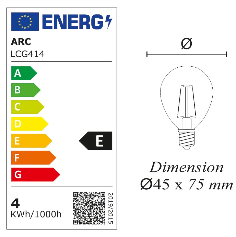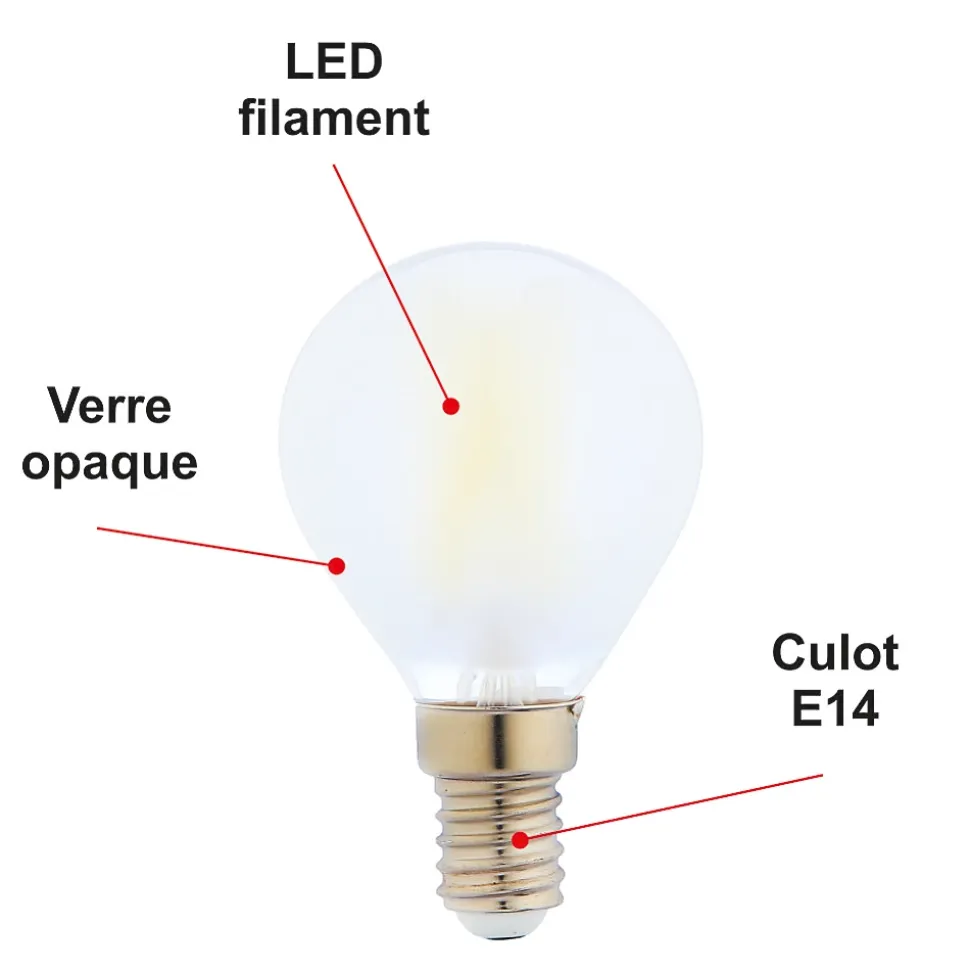 Des ampoules de haute qualité : CE et RoHS approuvés avec 2 ans de garantie.Des économies d’énergie significatives : économisez près de 90% sur votre facture d’électricité de l’éclairage en remplaçant vos ampoules à incandescence de 40 W par ces ampoules LED de 4 W.Une durée de vie extrêmement longue de 20 000 heures (vs 1 200 heures pour une ampoule à incandescence) pour un nombre de commutation garanti (ON/OFF) de 15 000.Un angle de faisceau large de 300 degrés, parfait pour un éclairage résidentiel et commercial.Il s’agit d’ampoules LED non réglables, non compatibles avec les variateurs de lumière.Une lumière de 470 lumens immédiatement, sans temps de chauffe pour atteindre son niveau d’éclairage maximal.Avec une température de couleur de 2 700 Kelvin, l’ampoule fournit une lumière blanc chaud, créant une atmosphère accueillante. Cette couleur d’éclairage est proche de la température d’une lumière produite par une ampoule incandescente ou une ampoule halogène.Applications : Les pièces dont le revêtement est clair et dans lesquelles vous souhaitez créer une ambiance chaleureuse ou obtenir un éclairage plus doux comme le salon, la salle à manger, la cuisine, les chambres.Caractéristiques techniques :Nombre d’ampoules : 10 piècesModèle : LED sphériqueForme : G45Culot : E14Type LED : filamentPuissance réelle : 4 WattEquivalence ampoule à incandescence : 40 WattAncienne classe énergétique : A++Nouvelle classe énergétique : EEconomie d’énergie : 90%Durée de vie : 20 000 heuresNombre de commutation (ON/OFF) : 15 000Variable / dimmable : nonAllumage : instantanéCouleur : blanc chaudTempérature (en kelvin) : 2700 KLumen : 470 LmAngle de diffusion : 300°Verre : clairDimensions : 45×75 mmTension : 220-240 VoltGarantie : 2 ansNormes : CE, RoHS