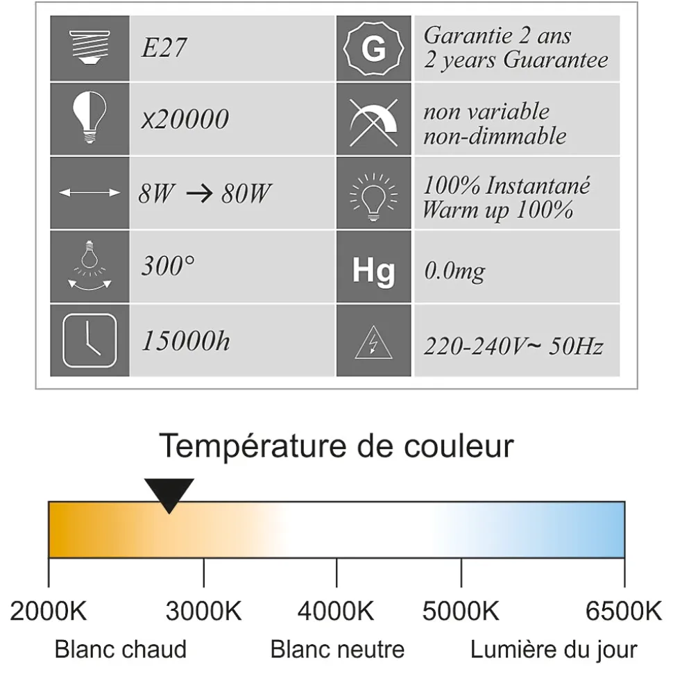 Des ampoules de haute qualité : CE et RoHS approuvés avec 2 ans de garantie.Des économies d’énergie significatives : économisez près de 90% sur votre facture d’électricité de l’éclairage en remplaçant vos ampoules à incandescence de 80 W par ces ampoules LED de 8 W.Une durée de vie extrêmement longue de 20 000 heures (vs 1 200 heures pour une ampoule à incandescence) pour un nombre de commutation garanti (ON/OFF) de 15 000.Un angle de faisceau large de 300 degrés, parfait pour un éclairage résidentiel et commercial.Il s’agit d’ampoules LED non réglables, non compatibles avec les variateurs de lumière.Une lumière de 950 lumens immédiatement, sans temps de chauffe pour atteindre son niveau d’éclairage maximal.Avec une température de couleur de 2 700 Kelvin, l’ampoule fournit une lumière blanc chaud, créant une atmosphère accueillante. Cette couleur d’éclairage est proche de la température d’une lumière produite par une ampoule incandescente ou une ampoule halogène.Applications : Les pièces dont le revêtement est clair et dans lesquelles vous souhaitez créer une ambiance chaleureuse ou obtenir un éclairage plus doux comme le salon, la salle à manger, la cuisine, les chambres.Caractéristiques techniques :Nombre d’ampoule : 10 piècesModèle : LED standardForme : A60Culot : E27Type LED : filamentPuissance réelle : 8 WattEquivalence ampoule à incandescence : 80 WattAncienne classe énergétique : A++Nouvelle classe énergétique : EEconomie d’énergie : 90%Durée de vie : 20 000 heuresNombre de commutation (ON/OFF) : 15 000Variable / dimmable : nonAllumage : instantanéCouleur : blanc chaudTempérature (en kelvin) : 2700 KLumen : 950 LmAngle de diffusion : 300°Verre : opaqueDimensions : 60×105 mmTension : 220-240 VoltGarantie : 2 ansNormes : CE, RoHS