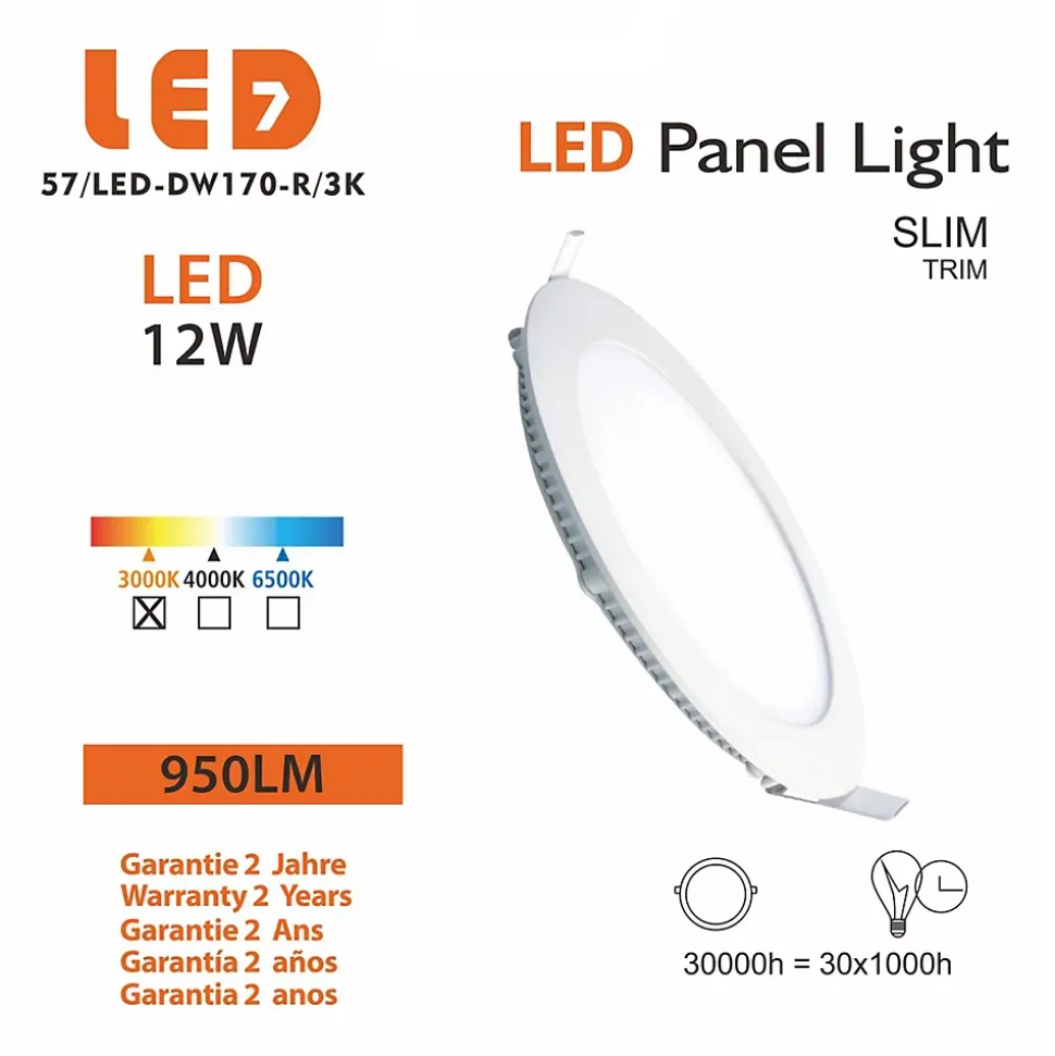 Température de couleur : Blanc chaud 3000KPuissance consommée : 12WFlux lumineux : 850-950 LumensDiamètre du spot : ø168*13mmDiamètre de perçage : ø155mmCouleur du produit (y compris le cadre) : BlancIndice de protection : IP 20Garantie fabricant : 2 ans