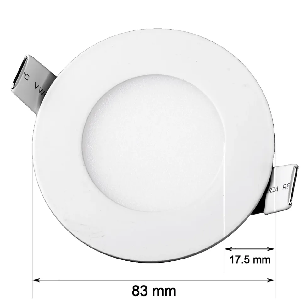 Température de couleur : Blanc Neutre 4000KPuissance consommée : 5WFlux lumineux : 375 LumensDiamètre du spot : ø83*13mmDiamètre de perçage : ø70mmCouleur du produit (y compris le cadre) : BlancIndice de protection : IP 20Garantie fabricant : 2 ans