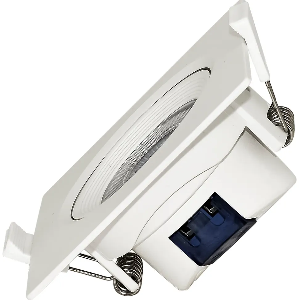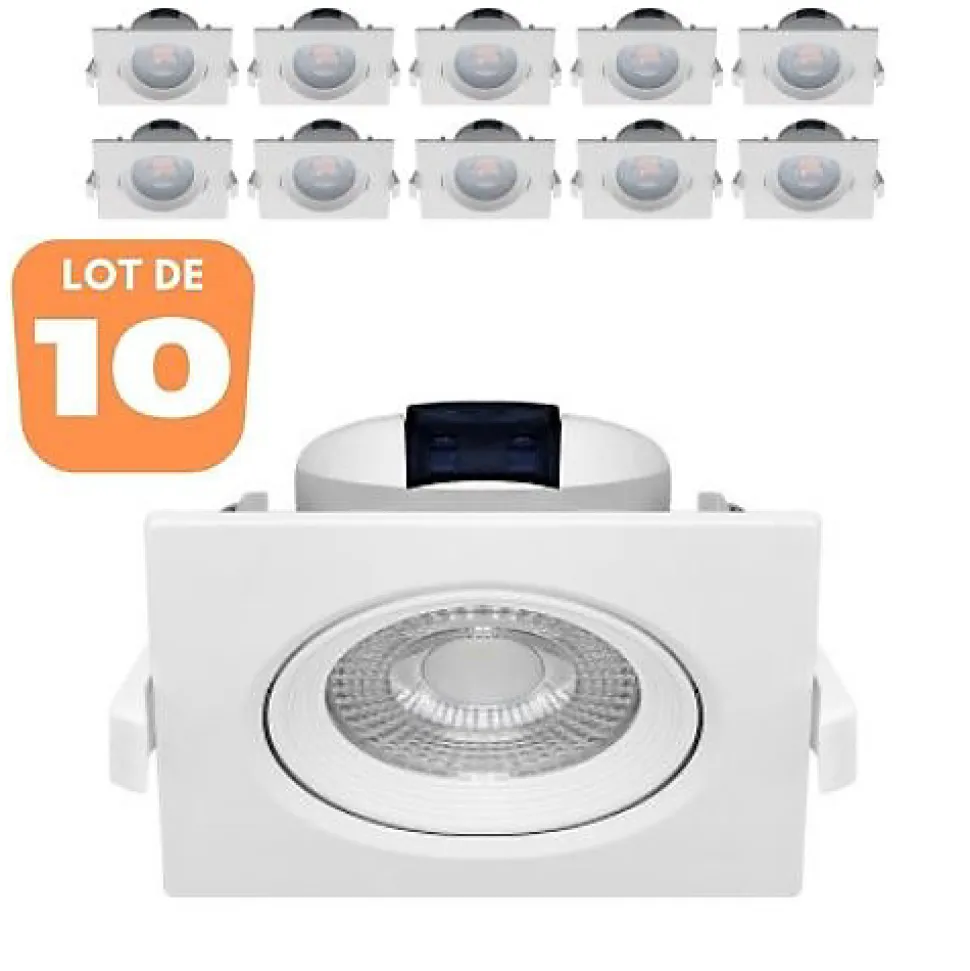 Le lot de 10 spots LED encastrables carré blanc 5W IP20 4000K permet une remise 30% par rapport au prix unitaire. Les spots sont munis de drivers intégrés et de ressorts de fixations pour une installation simple et rapide. Ils conviennent parfaitement pour l’éclairage général de la maison. Mais aussi les locaux commerciaux comme les restaurants, hôtels, boutiques, etc. Installation uniquement en zone 3 pour les salle de bain, selon la norme en vigueur. L’efficacité énergétique des spots LED encastrables carré blanc et leur longues durées de vie, permettent plus de 80% d’économie d’énergie, par rapport aux éclairages traditionnels incandescents ou halogènes. Leur indices de rendus des couleurs (IRC) est élevé Ra⩾80. De plus il n’émettent pas de radiation UV ni infrarouge. Leur températures de couleurs blanc naturel de 4000K, se rapproche de la lumière du jour. Leur puissances de 5W avec 380lm équivaut à la puissance d’une ampoule incandescente de plus de 35W. Ces spots sont orientables et cibles facilement les sujets avec un angle de diffusion de 38°, considéré comme moyen. Concernant leur matière, ils sont en polycarbonate (PC), qui est un thermoplastique connu pour ses propriétés mécaniques excellentes entre -80° et + 135 °C. Le produit est donc recyclable. Avec une durée de vie de 20000hrs, ce lot de 10 Spots LED encastrables carré blanc 5W IP20 4000K est durable et économique. Les dimensions des spots sont les suivantes, hauteur 44mm, longueur 90mm, largeur 90mm et diamètre de découpe 75mm. Hauteur : 44mm Longueur : 90mm Largeur : 90mm Diamètre découpe : 75mm Puissance : 5W Kelvin : 4000K Lumens : 380lm Indice de protection : IP20 Grâce