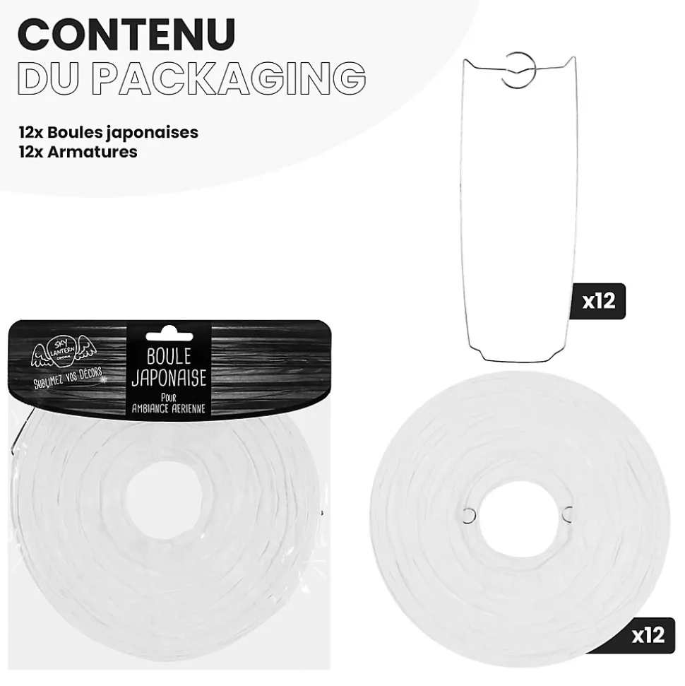 Lot de 12 lanternes papier 20 cm – Blanches : une décoration poétique et intemporelleAjoutez une touche d’élégance à vos événements avec ce lot de 12 boules japonaises en papier blanc de 20 cm. Leur teinte pure et lumineuse s’adapte à toutes les ambiances : mariage, baptême, anniversaire ou réception raffinée.Faciles à déplier et à suspendre avec du fil de pêche ou une cordelette, ces lanternes se montent rapidement sans outil. Leur format intermédiaire permet de décorer efficacement une salle, une tonnelle ou un jardin tout en conservant une belle légèreté visuelle.Pour sublimer votre mise en scène, associez-les à d’autres éléments comme des lampions, rosaces ou pompons. Le blanc s’accorde parfaitement avec toutes les couleurs, ce qui en fait une base idéale pour une décoration personnalisée et harmonieuse.Ces lanternes sont disponibles en plusieurs tailles, de 10 à 50 cm. Si le blanc n’est pas la couleur dominante de votre thème, explorez les nombreuses teintes de la gamme SkyLantern pour créer un décor sur mesure adapté à votre événement.SkyLantern, la référence des décorations lumineusesSkyLantern est une marque française basée à Lille, spécialisée dans la décoration japonaise à base de lampions en papier. Reconnue par les professionnels de l’événementiel, elle est régulièrement mise en avant pour la qualité et l’élégance de ses produits.