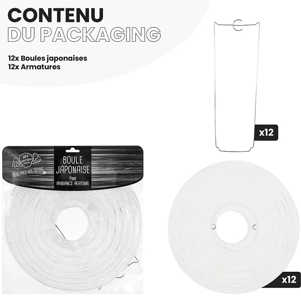 Lot de 12 lanternes papier 30 cm – Blanches : une décoration poétique et intemporelleApportez une note de pureté et d’élégance à vos événements avec ce lot de 12 boules japonaises en papier blanc de 30 cm. Leur teinte lumineuse et leur grande taille sont parfaites pour sublimer un mariage, une réception en plein air ou une décoration de salle raffinée.Faciles à installer, ces lanternes se déplient en quelques secondes et se suspendent aisément à l’aide d’un fil de pêche ou d’une cordelette. Leur diamètre de 30 cm permet de structurer l’espace tout en conservant une ambiance aérienne et délicate.Pour enrichir votre ambiance, associez-les à des lampions, rosaces ou pompons. Le blanc est une base idéale qui se marie avec toutes les teintes : pastel, doré, bois, ou couleurs vives, pour créer une composition personnalisée et harmonieuse.Disponibles en plusieurs tailles de 10 à 50 cm, ces lanternes s’adaptent à tous les types de décor. Si le blanc n’est pas la couleur dominante de votre thème, vous pouvez facilement l’associer à d’autres nuances de la gamme SkyLantern.SkyLantern, la référence des décorations lumineusesSkyLantern est une marque française basée à Lille, spécialisée dans la décoration japonaise à base de lampions en papier. Reconnue pour son savoir-faire et la qualité de ses produits, elle est régulièrement mise en avant par les professionnels de l’événementiel et la presse spécialisée.