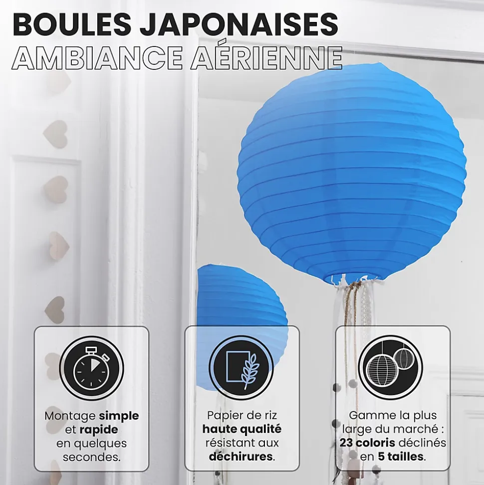 Lot de 12 lanterne papier de 40cm : Une décoration poétique pour tous vos évènementsFini de chercher d’autres idées pour embellir votre lieu de fête, les lanternes chinoises en papier de soie de SkyLantern.fr, vont vous permettre de créer un cadre poétique et authentique en quelques minutes. Epatez vos invités en utilisant votre sens du détail, puis composez en suivant vos idées. Votre lot de 12 boules papier bleu roi de 40 cm devrait vous surprendre grâce à l’éclat de ses teintes sans oublier sa jolie forme qui s’intègre dans tout lieu festif.Lanterne japonaise pour déco mariage bleu roi 40 cm : comment l’utiliser ?Ce type de boule chinoise est pratique pour les mariages, une Bar Mitzvah, une decoration anniversaire. Nos boules papier sont simples à déplier, il ne vous faudra pas longtemps pour décorer votre salle de couleur bleu roi. Le montage ne réclame pas d’outil compliqué. Pour un meilleur rendu, vous pouvez suspendre la suspension luminaire avec du fil de pêche ou de la cordelette. N’hésitez pas à faire passer un filin parcourant les hauteurs. Ces articles se marient bien avec les autres produits SkyLantern, les lampions LED, les étoiles, ou les rosaces.Si jamais la couleur bleu roi n’est pas la couleur dominante dans votre thème, vous pouvez compléter avec l'une des nombreuses teintes disponibles. Mixez différentes tailles en plus du diamètre 40 cm, modèles vendus: de 10 à 50 cm.SkyLantern est une marque française basée à Lille et spécialisée dans la deco japonaise à base de lampion papier. La marque est chaque année mise en avant par le top du top des professionnels de la déco et la presse spécialisée.