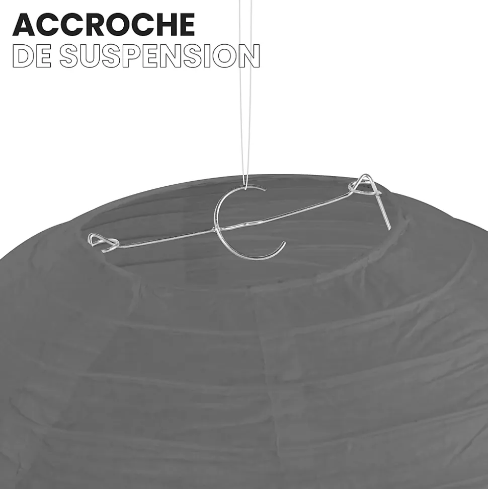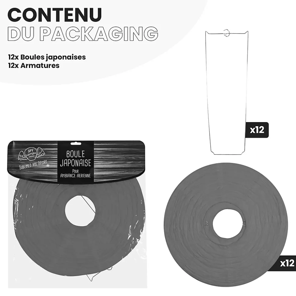 Lot de 12 lanterne papier de 40cm : Une décoration poétique pour tous vos évènementsFini de chercher d’autres idées pour embellir votre lieu de fête, les lanternes chinoises en papier de soie de SkyLantern.fr, vont vous permettre de créer un cadre poétique et authentique en quelques minutes. Epatez vos invités en utilisant votre sens du détail, puis composez en suivant vos idées. Votre lot de 12 boules papier grises de 40 cm devrait vous surprendre grâce à l’éclat de ses teintes sans oublier sa jolie forme qui s’intègre dans tout lieu festif.Lanterne japonaise pour déco mariage grise 40 cm : comment l’utiliser ?Ce type de boule chinoise est pratique pour les mariages, une Bar Mitzvah, une decoration anniversaire. Nos boules papier sont simples à déplier, il ne vous faudra pas longtemps pour décorer votre salle de couleur grise. Le montage ne réclame pas d’outil compliqué. Pour un meilleur rendu, vous pouvez suspendre la suspension luminaire avec du fil de pêche ou de la cordelette. N’hésitez pas à faire passer un filin parcourant les hauteurs. Ces articles se marient bien avec les autres produits SkyLantern, les lampions LED, les étoiles, ou les rosaces.Si jamais la couleur grise n’est pas la couleur dominante dans votre thème, vous pouvez compléter avec l'une des nombreuses teintes disponibles. Mixez différentes tailles en plus du diamètre 40 cm, modèles vendus: de 10 à 50 cm.SkyLantern est une marque française basée à Lille et spécialisée dans la deco japonaise à base de lampion papier. La marque est chaque année mise en avant par le top du top des professionnels de la déco et la presse spécialisée.