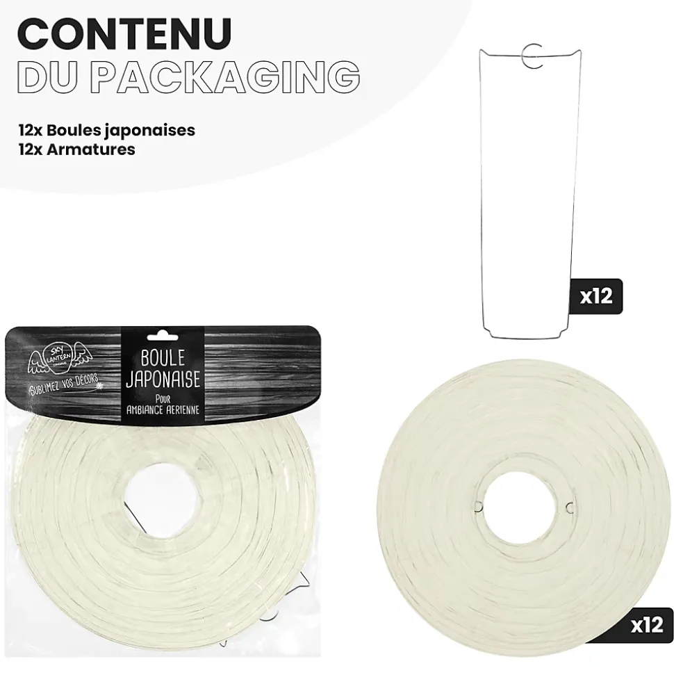 Lot de 12 lanterne papier de 30cm: Une décoration poétique pour tous vos évènementsFini de chercher d’autres idées pour embellir votre lieu de fête, les lanterne chinoise en papier de soie de SkyLantern.fr, vont vous permettre de créer un cadre poétique et authentique en quelques minutes. Épatez vos invités en utilisant votre sens du détail, puis composez en suivant vos idées. Votre lot de 12 boule papier ivoire de 30 cm devrait vous surprendre grâce à l’éclat de ses teintes sans oublier sa jolie forme qui s’intègre dans tout lieu festif.Lanterne japonaise pour déco mariage ivoire 30 cm: comment l’utiliser ?Ce type de boule chinoise est pratique pour les mariages, un baptême, une décoration d’anniversaire. Nos boules papier sont simples à déplier, il ne vous faudra pas longtemps pour décorer votre salle de couleur ivoire. Le montage ne réclame pas d’outil compliqué. Pour un meilleur rendu, vous pouvez suspendre la suspension luminaire avec du fil de pêche ou de la cordelette. N’hésitez pas à faire passer un filin parcourant les hauteurs. Ces articles se marient bien avec les autres produits SkyLantern, les lampions LED, les étoiles, ou les rosaces. Si jamais l’ivoire n’est pas la couleur dominante dans votre thème, vous pouvez compléter avec l’une des nombreuses teintes disponibles. Mixez différentes tailles en plus du diamètre 30 cm, modèles vendus: de 10 à 50 cm.SkyLantern est une marque française basée à Lille et spécialisée dans la deco japonaise à base de lampion papier. La marque est chaque année mise en avant par le top du top des professionnels de la déco et la presse spécialisée.
