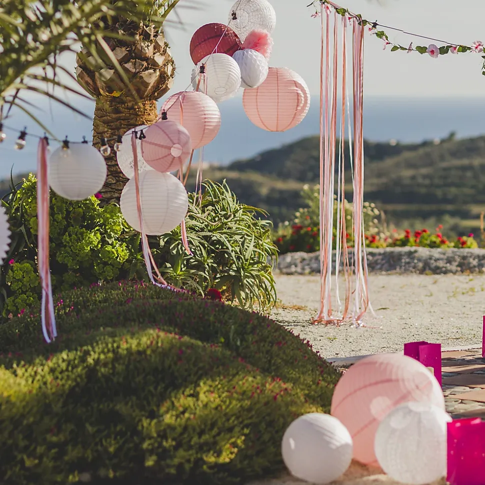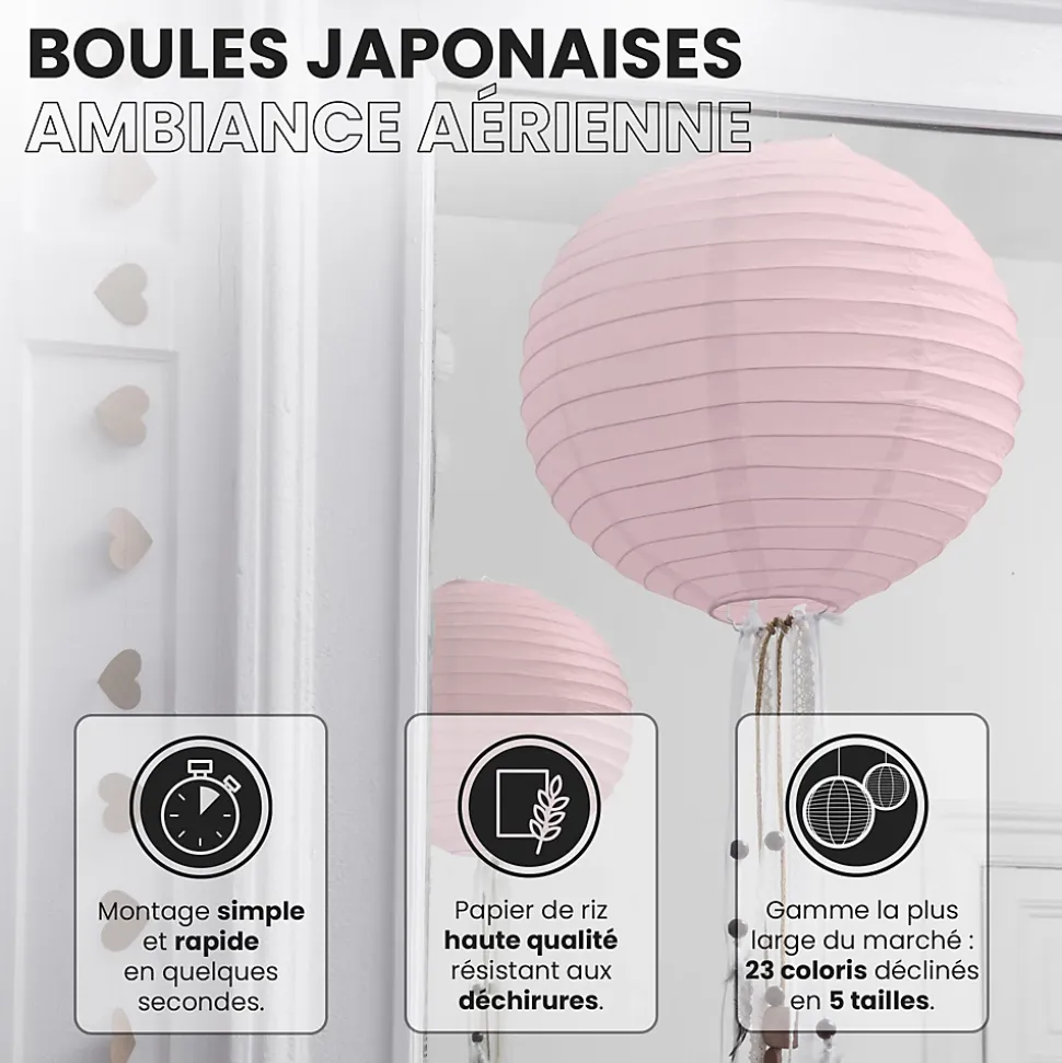 Lot de 12 lanterne papier de 30cm: Une décoration poétique pour tous vos évènementsFini de chercher d’autres idées pour embellir votre lieu de fête, les lanternes chinoises en papier de soie de SkyLantern.fr, vont vous permettre de créer un cadre poétique et authentique en quelques minutes. Epatez vos invités en utilisant votre sens du détail, puis composez en suivant vos idées. Votre lot de 12 boules papier rose pâle de 30 cm devrait vous surprendre grâce à l’éclat de ses teintes sans oublier sa jolie forme qui s’intègre dans tout lieu festif.Lanterne japonaise pour déco mariage rose pâle 30 cm: comment l’utiliser ?Ce type de boule chinoise est pratique pour les mariages, une Bar Mitzvah, une decoration anniversaire. Nos boules papier sont simples à déplier, il ne vous faudra pas longtemps pour décorer votre salle de couleur rose pâle. Le montage ne réclame pas d’outil compliqué. Pour un meilleur rendu, vous pouvez suspendre la suspension luminaire avec du fil de pêche ou de la cordelette. N’hésitez pas à faire passer un filin parcourant les hauteurs. Ces articles se marient bien avec les autres produits SkyLantern, les lampions LED, les étoiles, ou les rosaces. Si jamais la couleur rose pâle n’est pas la couleur dominante dans votre thème, vous pouvez compléter avec l’une des nombreuses teintes disponibles. Mixez différentes tailles en plus du diamètre 30 cm, modèles vendus: de 10 à 50 cm.SkyLantern est une marque française basée à Lille et spécialisée dans la deco japonaise à base de lampion papier. La marque est chaque année mise en avant par le top du top des professionnels de la déco et la presse spécialisée.