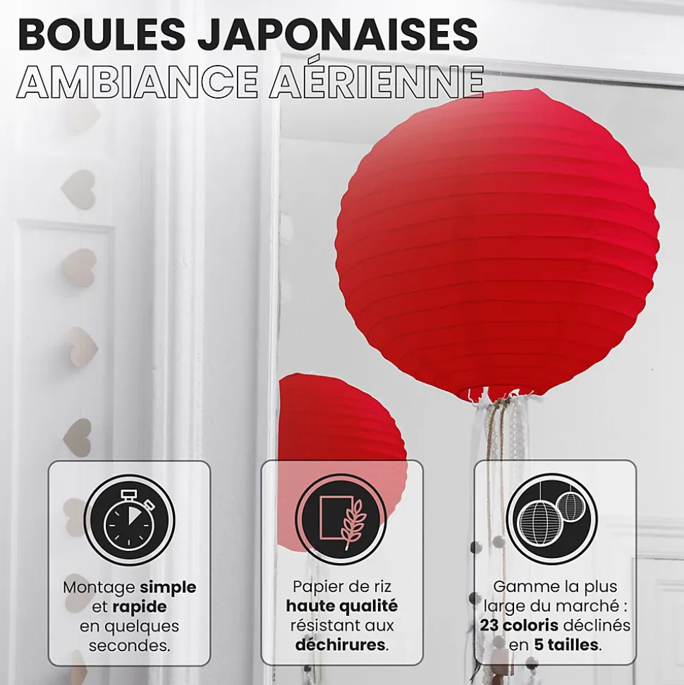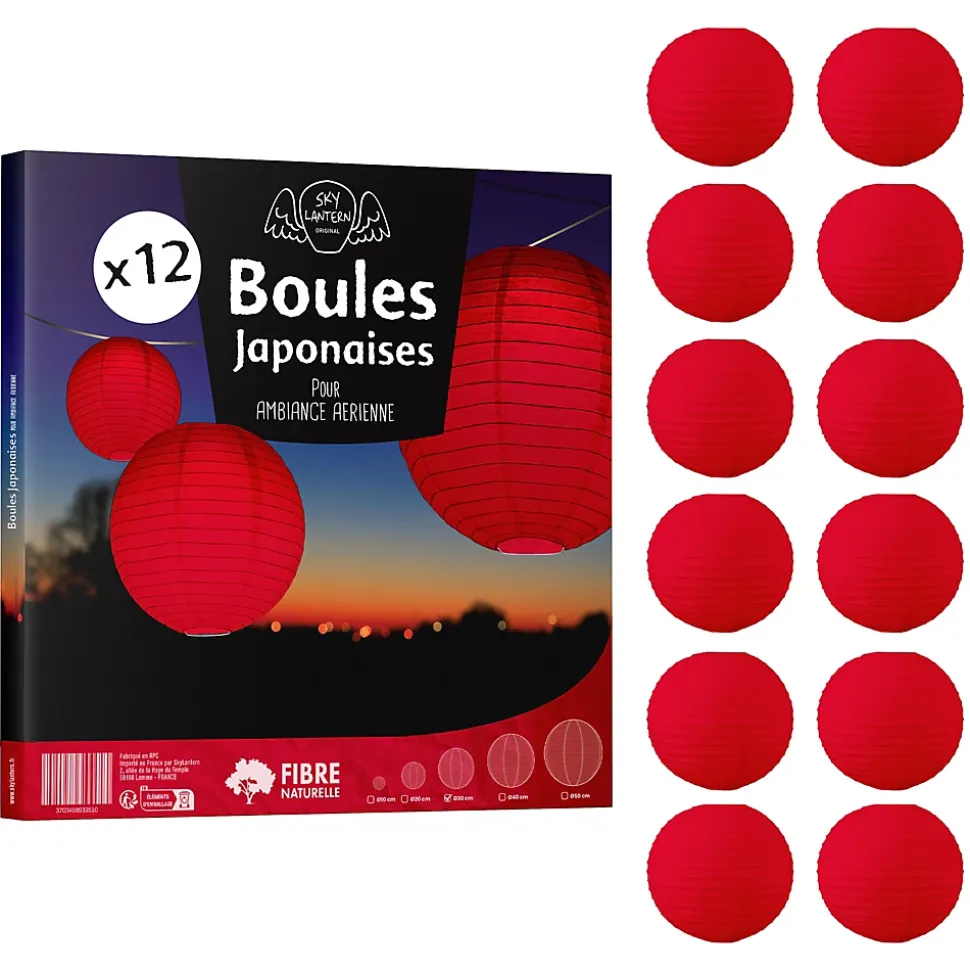 Lot de 12 lanterne papier de 30cm: Une décoration poétique pour tous vos évènementsFini de chercher d’autres idées pour embellir votre lieu de fête, les lanterne chinoise en papier de soie de SkyLantern.fr, vont vous permettre de créer un cadre poétique et authentique en quelques minutes. Epatez vos invités en utilisant votre sens du détail, puis composez en suivant vos idées. Votre lot de 12 boule papier rouge de 30 cm devrait vous surprendre grâce à l’éclat de ses teintes sans oublier sa jolie forme qui s’intègre dans tout lieu festif.Lanterne japonaise pour déco mariage rouge 30 cm: comment l’utiliser ?Ce type de boule chinoise est pratique pour les mariages, une Bar Mitzvah, une decoration anniversaire. Nos boules papier sont simples à déplier, il ne vous faudra pas longtemps pour décorer votre salle de couleur rouge. Le montage ne réclame pas d’outil compliqué. Pour un meilleur rendu, vous pouvez suspendre la suspension luminaire avec du fil de pêche ou de la cordelette. N’hésitez pas à faire passer un filin parcourant les hauteurs. Ces articles se marient bien avec les autres produits SkyLantern, les lampions LED, les étoiles, ou les rosaces. Si jamais le rouge n’est pas la couleur dominante dans votre thème, vous pouvez compléter avec l’une des nombreuses teintes disponibles. Mixez différentes tailles en plus du diamètre 30 cm, modèles vendus: de 10 à 50 cm.SkyLantern est une marque française basée à Lille et spécialisée dans la deco japonaise à base de lampion papier. La marque est chaque année mise en avant par le top du top des professionnels de la déco et la presse spécialisée.