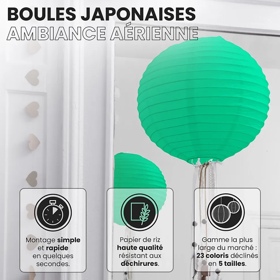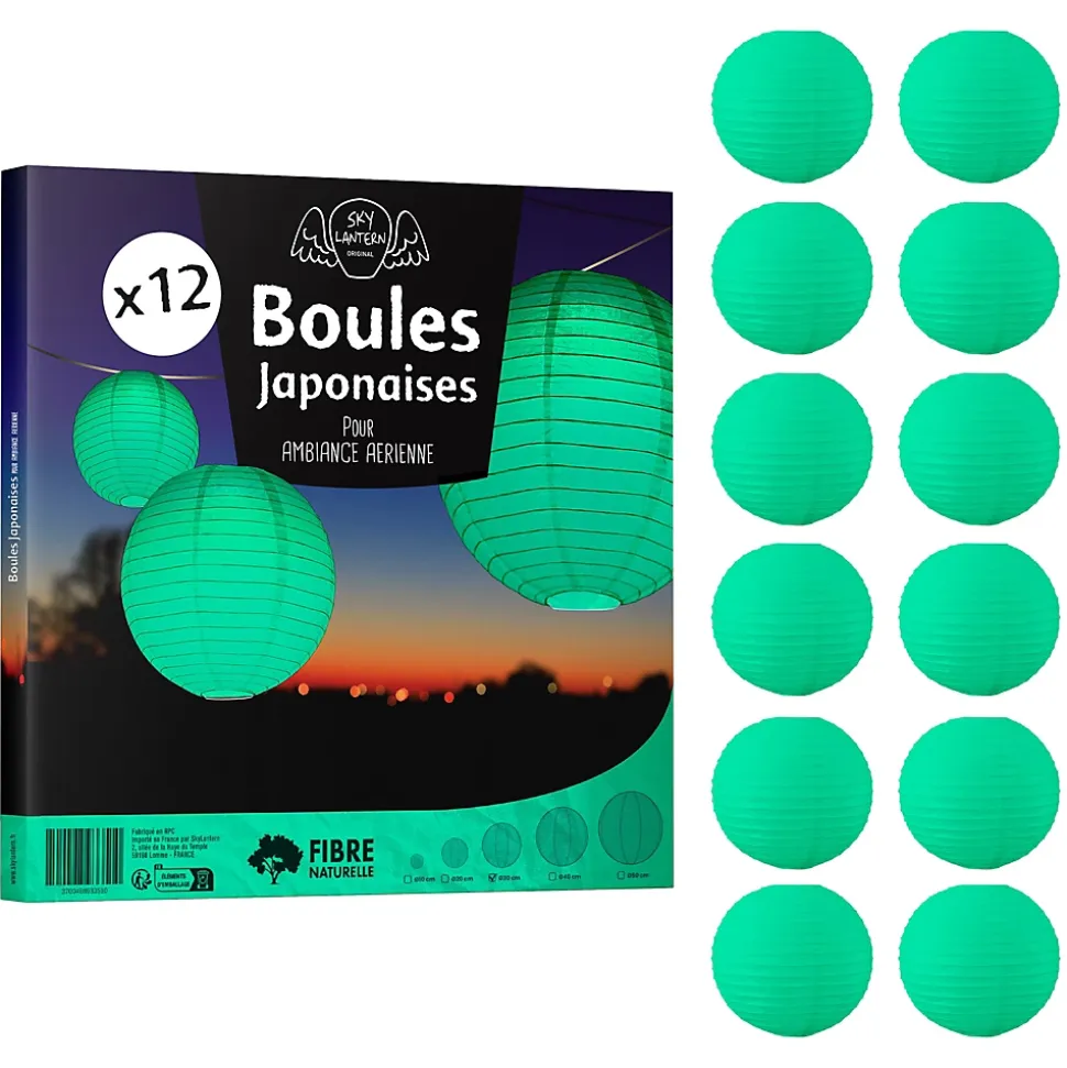 Lot de 12 lanterne papier de 30cm: Une décoration poétique pour tous vos évènementsFini de chercher d’autres idées pour embellir votre lieu de fête, les lanternes chinoises en papier de soie de SkyLantern.fr, vont vous permettre de créer un cadre poétique et authentique en quelques minutes. Epatez vos invités en utilisant votre sens du détail, puis composez en suivant vos idées. Votre lot de 12 boules papier vert d’eau de 30 cm devrait vous surprendre grâce à l’éclat de ses teintes sans oublier sa jolie forme qui s’intègre dans tout lieu festif.Lanterne japonaise pour déco mariage vert d’eau 30 cm: comment l’utiliser ?Ce type de boule chinoise est pratique pour les mariages, une Bar Mitzvah, une decoration anniversaire. Nos boules papier sont simples à déplier, il ne vous faudra pas longtemps pour décorer votre salle de couleur vert d’eau. Le montage ne réclame pas d’outil compliqué. Pour un meilleur rendu, vous pouvez suspendre la suspension luminaire avec du fil de pêche ou de la cordelette. N’hésitez pas à faire passer un filin parcourant les hauteurs. Ces articles se marient bien avec les autres produits SkyLantern, les lampions LED, les étoiles, ou les rosaces. Si jamais la couleur vert d’eau n’est pas la couleur dominante dans votre thème, vous pouvez compléter avec l’une des nombreuses teintes disponibles. Mixez différentes tailles en plus du diamètre 30 cm, modèles vendus: de 10 à 50 cm.SkyLantern est une marque française basée à Lille et spécialisée dans la deco japonaise à base de lampion papier. La marque est chaque année mise en avant par le top du top des professionnels de la déco et la presse spécialisée.