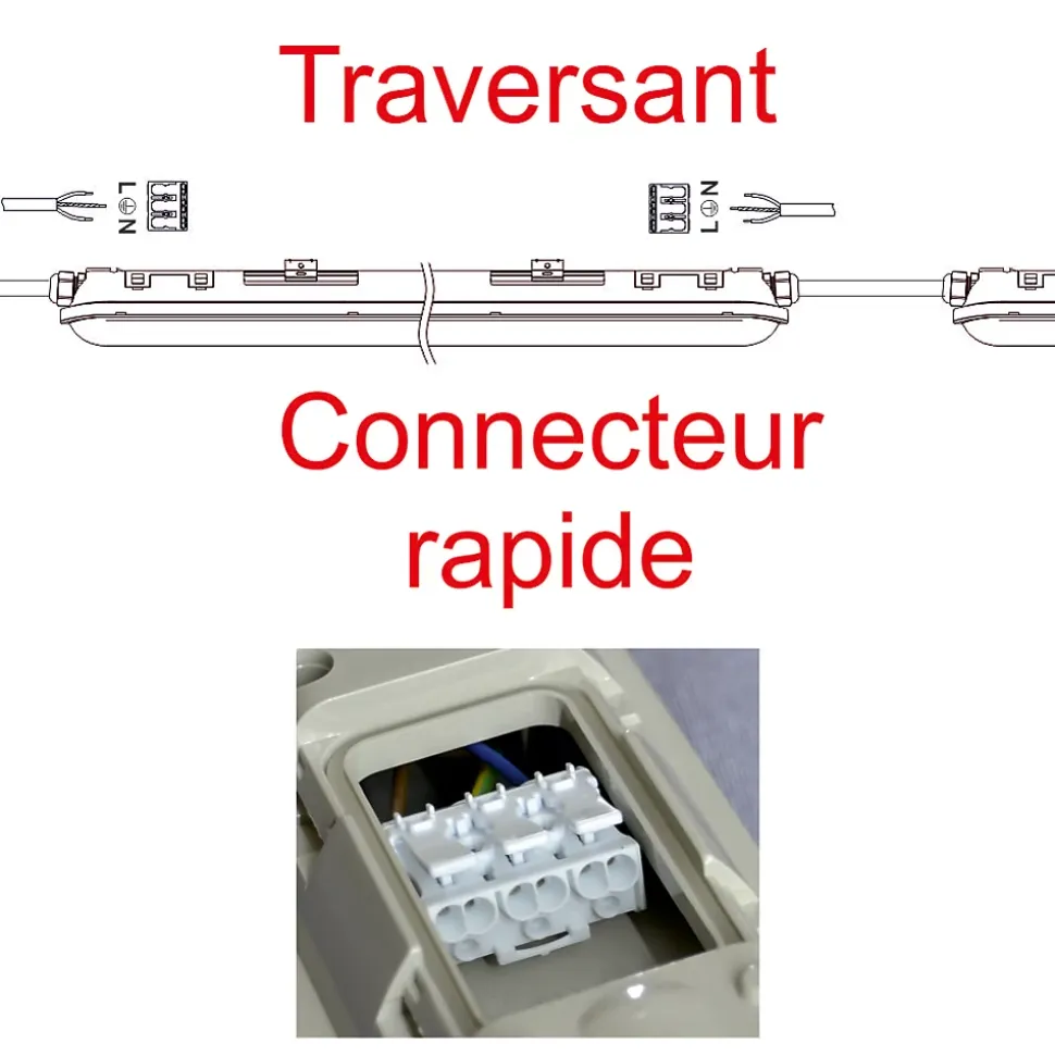 Cette réglette LED de 55W avec LED intégrée est la solution idéale pour remplacer les luminaires étanches à néon 2x58W, offrant une alternative plus performante et économique.Avec son flux lumineux élevé de 6600 lumens et une consommation réduite de 55W seulement, elle garantit des économies d’énergie considérables sans compromis sur la qualité d’éclairage. Sa température de couleur lumière du jour (6500K) assure un éclairage homogène et agréable pour tous types d’environnements professionnels ou industriels.Robuste et parfaitement étancheAvec son indice de protection IP65, cette réglette est totalement étanche à l’eau et à la poussière, idéale pour une installation en environnements exigeants : usines, parkings, garages, ateliers et entrepôts. Son indice de résistance aux chocs IK08 lui confère une excellente durabilité.Installation rapide et pratiqueSystème de câblage traversant permettant le chaînage de plusieurs réglettes sans multiplication des raccordements.Connexion simplifiée pour une installation en saillie ou suspendue en toute facilité.Caractéristiques techniques :Nombre de pièce : 12 piècesPuissance réelle : 55WÉquivalence : 2x58WFlux lumineux : 6600 lm (120 lm/W)Ancienne norme 2012 : A+Nouvelle norme 2021 : ETempérature de couleur : 6500K (lumière du jour)Angle de diffusion : 120°Indice de protection : IP65 (étanche)Indice de résistance : IK08 (antichoc)Durée de vie : 50 000 heuresNombre de cycles ON/OFF : 30 000Facteur de puissance : > 0.9Type de LED : SMDDiffuseur : OpaqueMatériau du cadre : GrisTension : 220-240VInstallation : Saillie ou suspendueDimension : 1500 x 72 x 61 mmNormes : CE, ROHSGarantie : 5 ansApplications :Industrie & entrepôt : Usines, zones de stockageMobilité & stationnement : Parkings, garagesAteliers & locaux professionnelsUn éclairage puissant, économique et durable pour tous vos espaces !