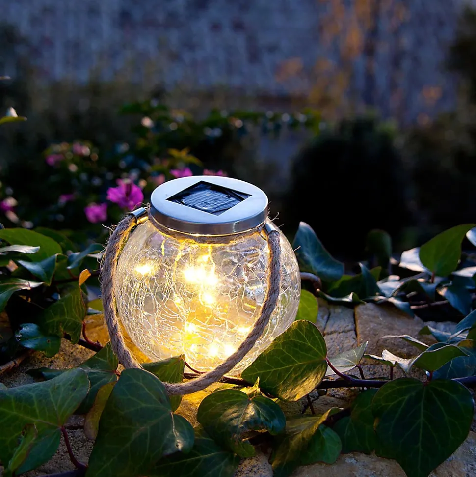 - Lot de 2 boules solaires décoratives en verre craquelé avec poignée en corde et anneaux métalliques pour transport et suspension.