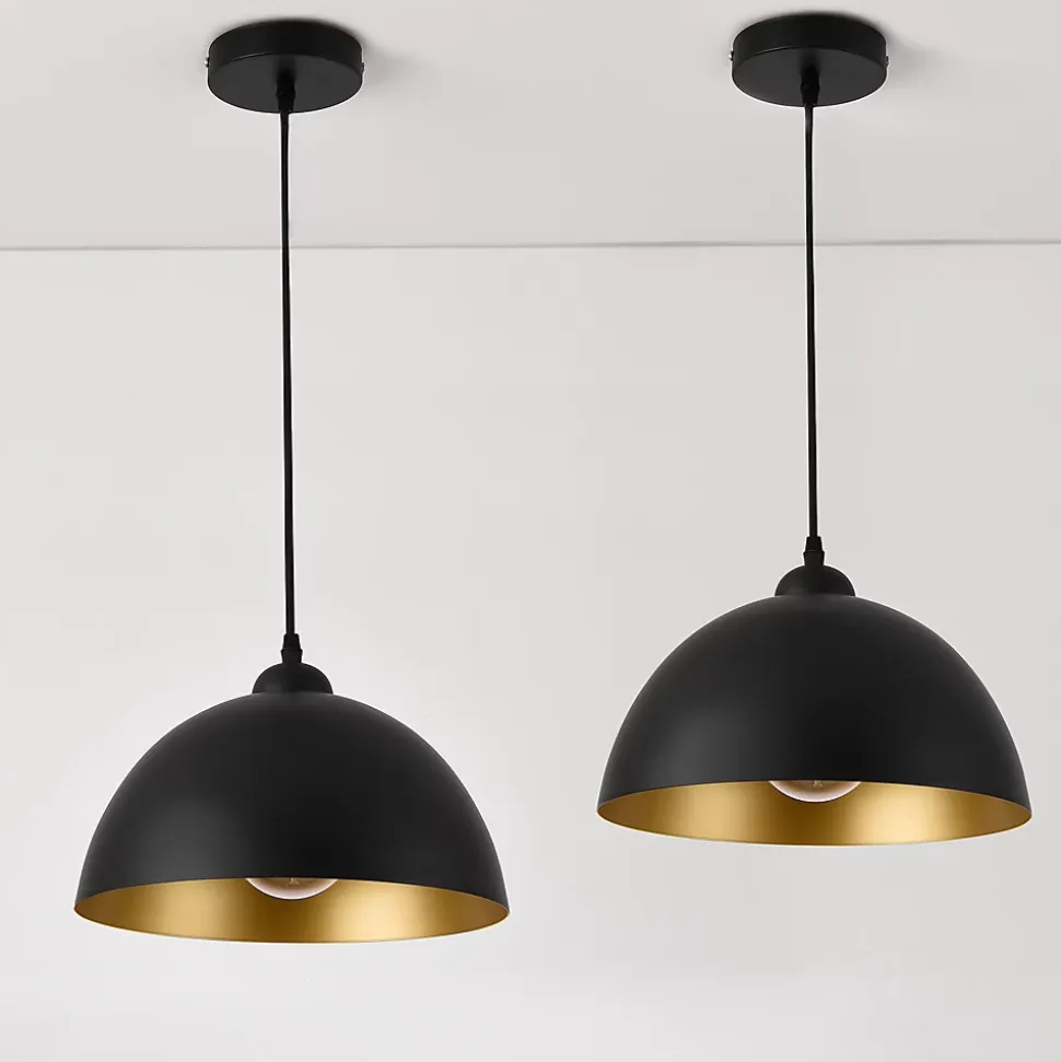 Lot de 2 suspensions d’éclairageCes luminaires suspendus seront des accessoires idéaux de votre maison. Gâce à leur style moderne, leurs belles couleurs et leur design élégant, elles pourront devenir l’ornement de votre entourage. Ces lampes à suspension pourront assurer l’éclairage de votre salle à manger, votre salon ou votre chambre. Description : – lot de 2 lampes suspendues stylées – adaptable dans n’importe quelle pièce de la maison – construction solide avec design de qualité – la hauteur de la suspension est réglable Alimentation : 230V, 50Hz Interrupteur : mural Douille : 1 x E27 max. 60W par lampe (pas d’ampoules dans la livraison) Matière : métal Couleur : noir à l’extérieur, doré à l’intérieur Dimensions par lampe : hauteur : ca. 145 cm avec le câble longueur du câble : ca. 128 cm diamètre de l’abat-jour : ca. 30 cm hauteur de l’abat-jour : 18 cm diamètre de la fixation : ca. 12 cm Contenu de la livraison : 2 x lampes à suspension [sans ampoules] Produit de la marque [lux.pro].