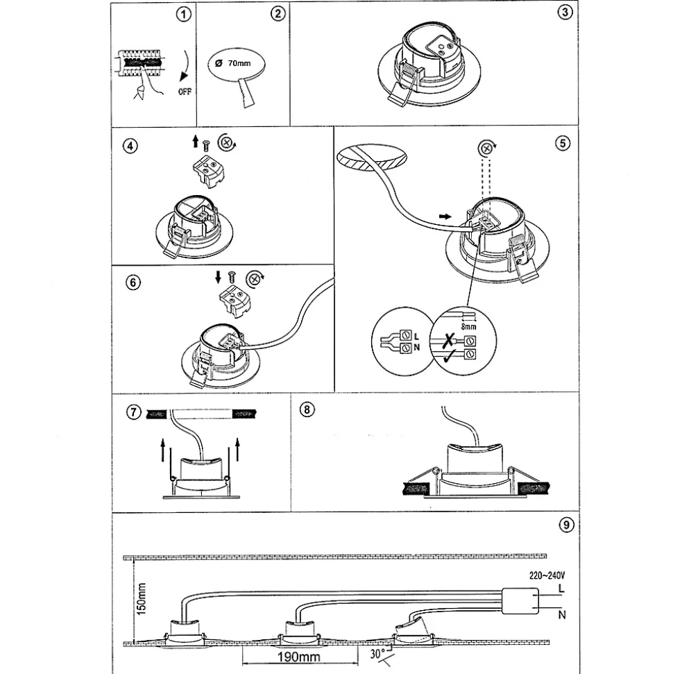 2 pièces x Spot Led Etanche 7W 595Lm IP65Température de couleur : Blanc Chaud 3000KPuissance consommée : 7WFlux lumineux : 595 LumensTension nominale : AC 220-240VDiamètre du spot : ø90xH40 mmDiamètre d’encastrement : ø70 mmCouleur du produit (y compris le cadre) : BlancIndice de protection : IP 65Garantie fabricant : 2 ans