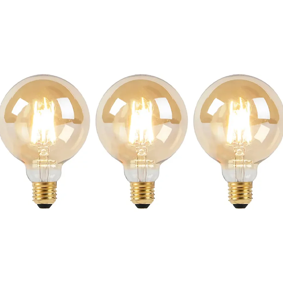 Ces 3 ampoules LED sont toutes G95, ce qui signifie qu’elles ont un diamètre extra large de 9,5 cm. De vraies créatrices d’ambiance ! Ce lot de 3 ampoules LED à filament E27 est doté d’un magnifique verre doré qui crée un effet chaleureux et agréable. Sa puissance maximale est de 8 watts. L’ampoule est dimmable en Kelvin (couleur de la lumière) : elle peut être atténuée de 2 000 Kelvin à 2 700 Kelvin. Elle émet également 806 lumens. Le choix parfait si vous recherchez des ampoules grandes et belles !