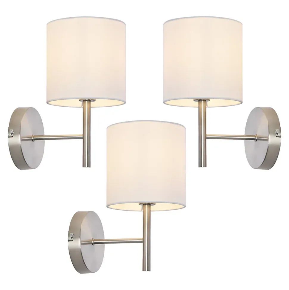 Lot de 3 appliques muralesNotre ensemble de 3 appliques murales au style élégant et intemporel complétera parfaitement la décoration de votre salon, chambre ou bureau. Elles apporteront une ambiance chaleureuse à votre intérieur et s’adaptera facilement à tous les styles et toutes les pièces de vie.Description :- set de 3 appliques murales modernes et stylées- idéales pour toutes pièces de la maison- montage rapide et facile- dotée d’une douille par lampeCaractéristiques techniques :- douille : 1 x E14, max. 40W (livraison sans ampoule)- alimentation : 230V, 50HzMatière :- structure : métal- abat-jour : tissu (100% polyester)Dimensions :- totales (hauteur x largeur x profondeur) : 27 x 15 x 21 cm- abat-jour (hauteur x diamètre) : 15 x 15 cm- support mural (diamètre) : 12 cmCouleur :- structure : argent- abat-jour : blancContenu de la livraison :3 x appliques murales (l’ampoule ne fait pas partie de l’offre)Produit de la marque :lux.pro