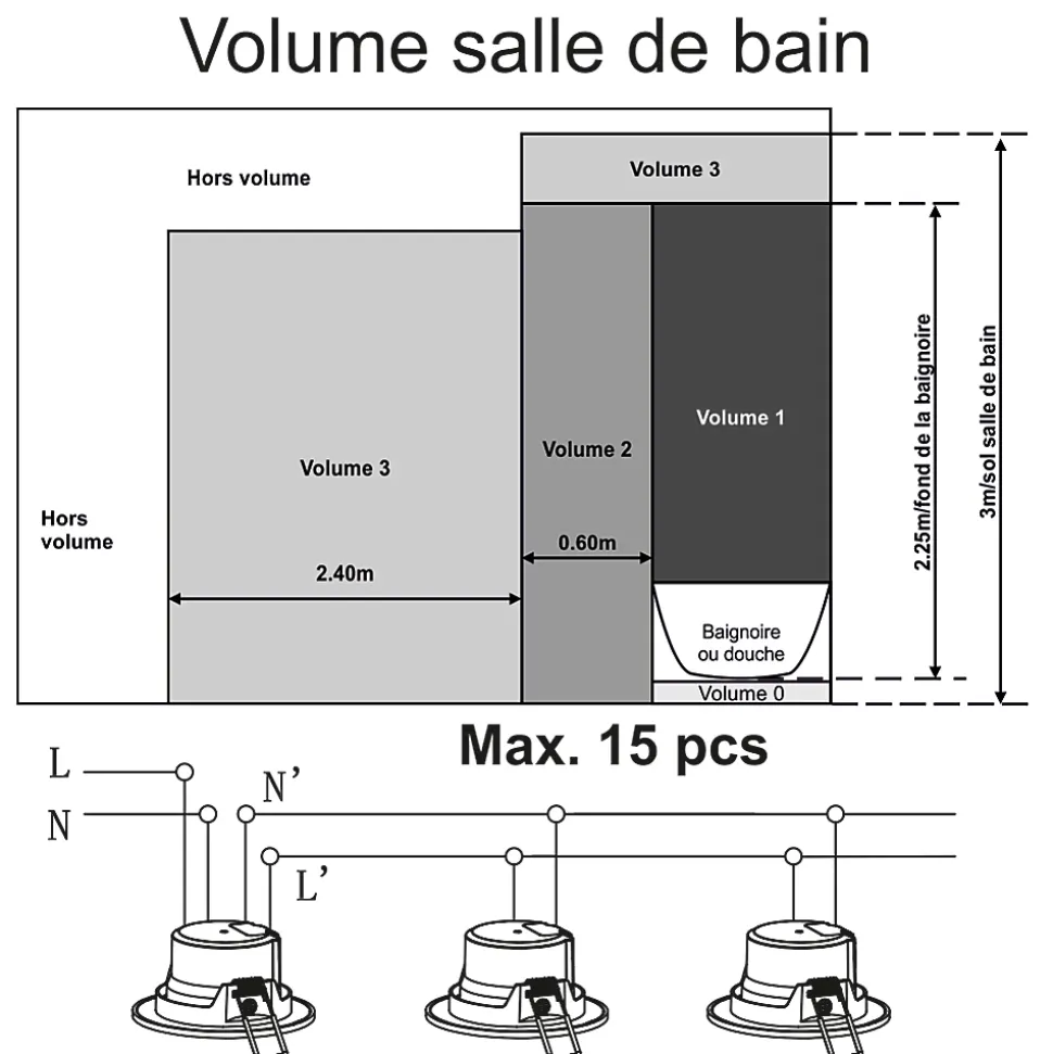 Ces spots LED encastrables de 6.5W (équivalent 50W) sont spécialement conçus pour les zones humides (IP65), idéal pour un éclairage de la salle de bain. Grâce à sa température de 3000K (blanc chaud), ils diffusent une lumière douce et homogène, créant une ambiance chaleureuse dans votre salle d’eau.Conforme aux normes BBC (RT2012 / RE2020)Ces spots répondent aux exigences des bâtiments basse consommation en limitant les déperditions thermiques et en assurant une parfaite étanchéité à l’air grâce à un joint d’étanchéité. Ils empêchent également toute infiltration d’humidité grâce à sa face avant protégée (IP65).Design compact et installation facileAvec un encombrement réduit de 47 mm et un driver intégré, ce spot est parfait pour les faux plafonds avec peu d’espace. De type traversant, il peut être connecté en série pour une installation simplifiée.Avantages :Remplacement idéal des anciens spots halogènes : Économisez sur l’éclairage et le chauffage.Large diffusion (100°) : Assure une lumière puissante et uniforme dans toute la pièce.Connecteur rapide : connexion facilité sans outilsTraversant : connectable en série pour une installation simplifiée..Caractéristiques techniques :Nombre spots : 3 piècesPuissance réelle : 6.5WFlux lumineux : 570 lm (87 lm/W)Ancienne norme 2019 : A+Nouvelle norme 2021 : FTempérature de couleur : Blanc chaud (3000K)Indice de protection : IP65 (parfait pour zones humides)Durée de vie : 25 000 heuresAngle de diffusion : 100°Classe de protection : 2 (double isolation)Dimensions : 80×47 mm (perçage 70 mm)Tension : 220-240VGarantie : 5 ansNormes : CE, ROHS, EMC