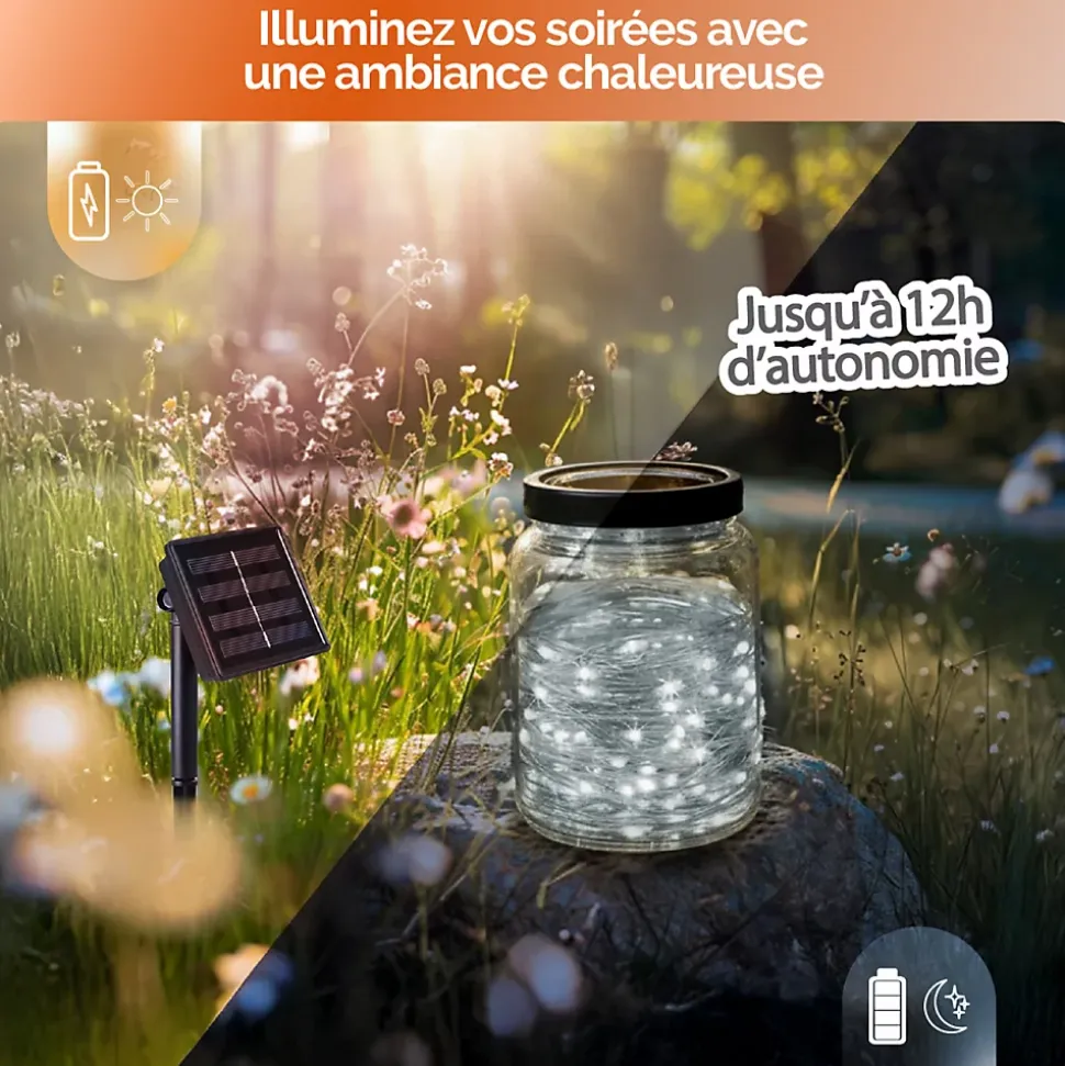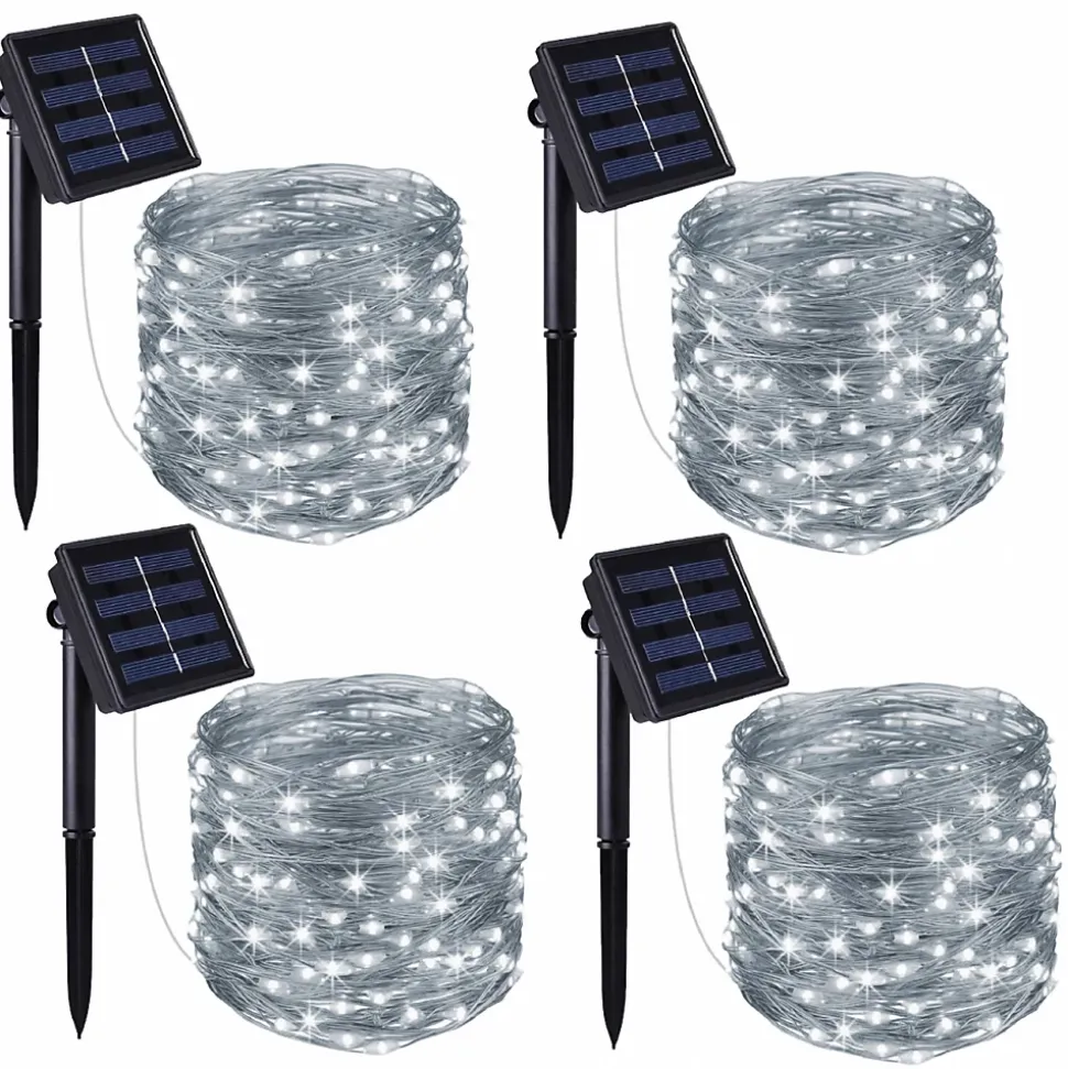 Lot de 4 guirlandes solaires extérieur lumineuses jardin, terrasse - Ampoules LED 8 modes - 7 m - Blanc froid - Linxor
