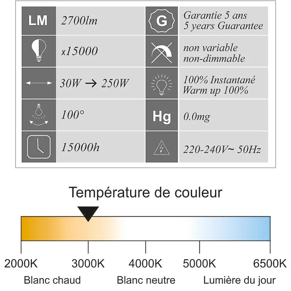 Ces projecteurs LED de 30W, équivalents à des modèles halogènes de 250W, offrent une lumière puissante et homogène de 2700 lumens avec une teinte blanc chaud (3000K). Ils permettent un éclairage efficace tout en réduisant considérablement la consommation d’énergie.Robustesse et résistanceConçus pour une utilisation extérieure, ces projecteurs disposent d’un corps en aluminium et d’un indice de protection IP65, leur garantissant une haute résistance aux intempéries, à l’humidité et à la poussière. Leur certification IK10 atteste d’une grande robustesse contre les chocs, et leur diffuseur opaque limite l’éblouissement.Eblouissement limitéSon diffuseur en PVC opaque assure un éclairage homogène et réduit efficacement l’éblouissement pour un confort visuel optimal.Installation simplifiéeGrâce à leur connexion automatique directe, l’installation est rapide et sans contraintes, ne nécessitant ni boîte de dérivation ni dominos. Attention : aucun câble n’est fourni.